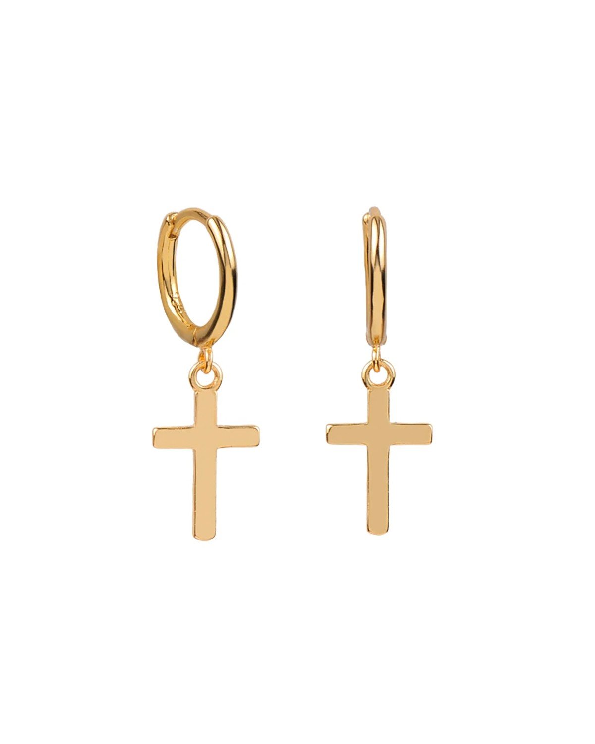 Creolen mit kreuzförmigem Anhänger aus 925er Sterlingsilber, vergoldet mit 18 Karat. Diese Ohrringe sind super vielseitig und können jeden Tag getragen werden.