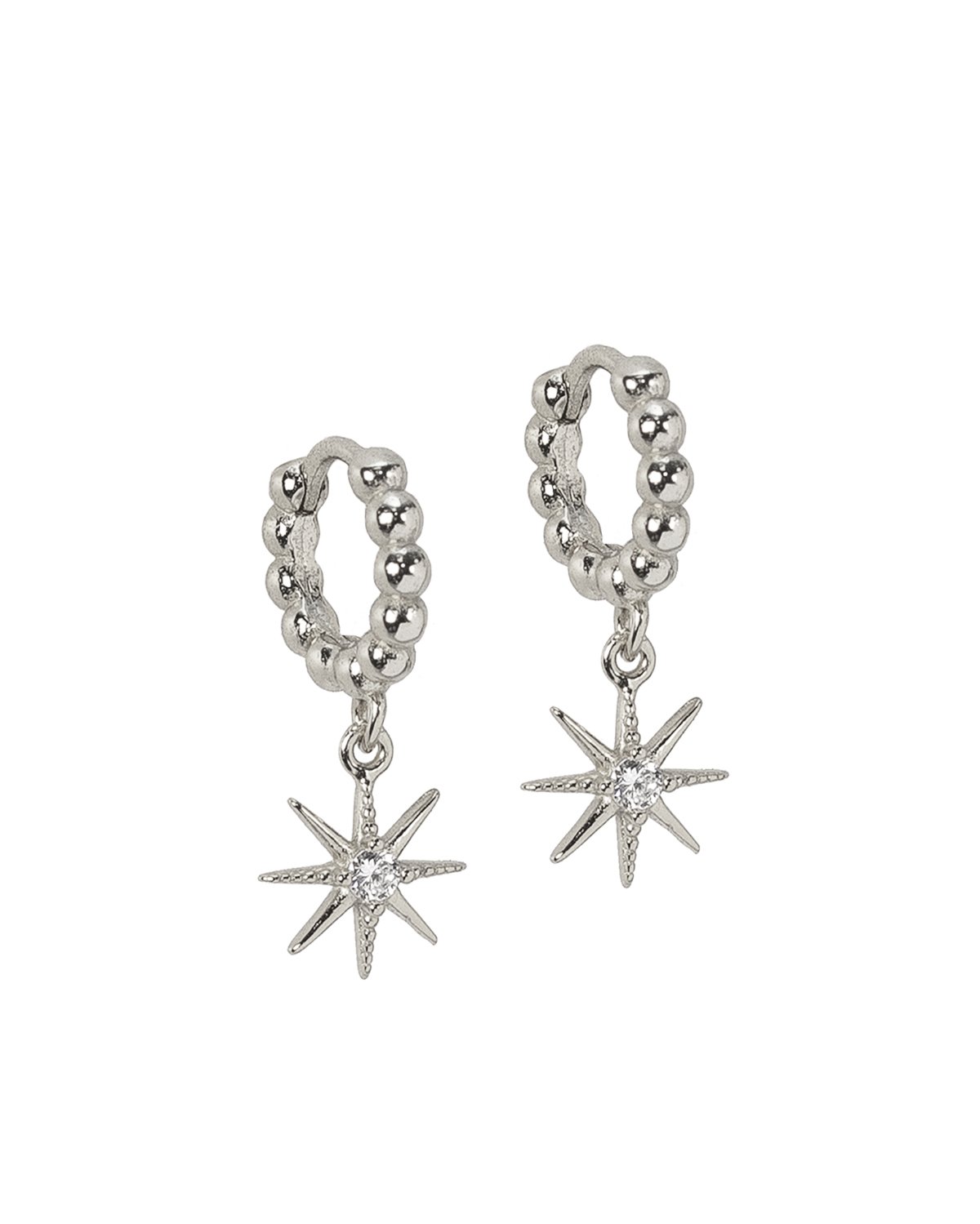 Astro silver is a pair of beaded hoop earrings with a dangling star pendant with a cubic zirconia gemstone made of 925 sterling silver.