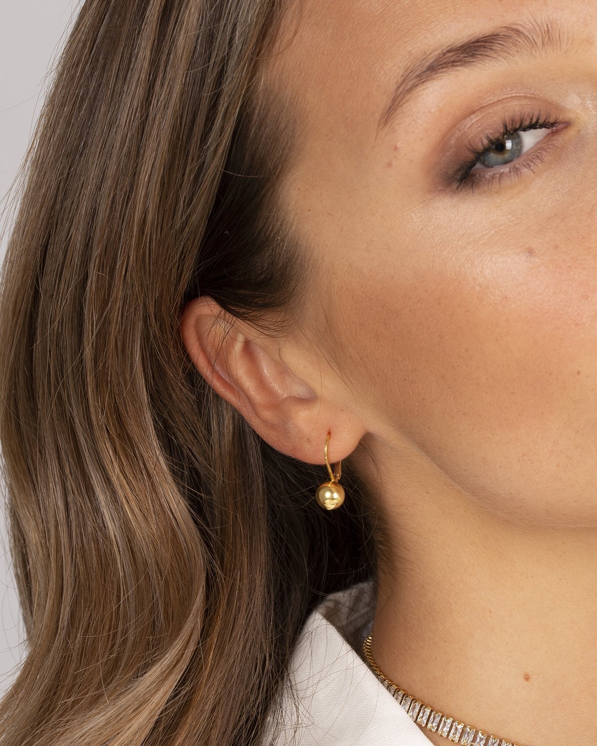 Hoop earrings with latch backs and a dainty ball made of 18 carat gold plated 925 sterling silver. These classic hoops are an everyday wear must-have.