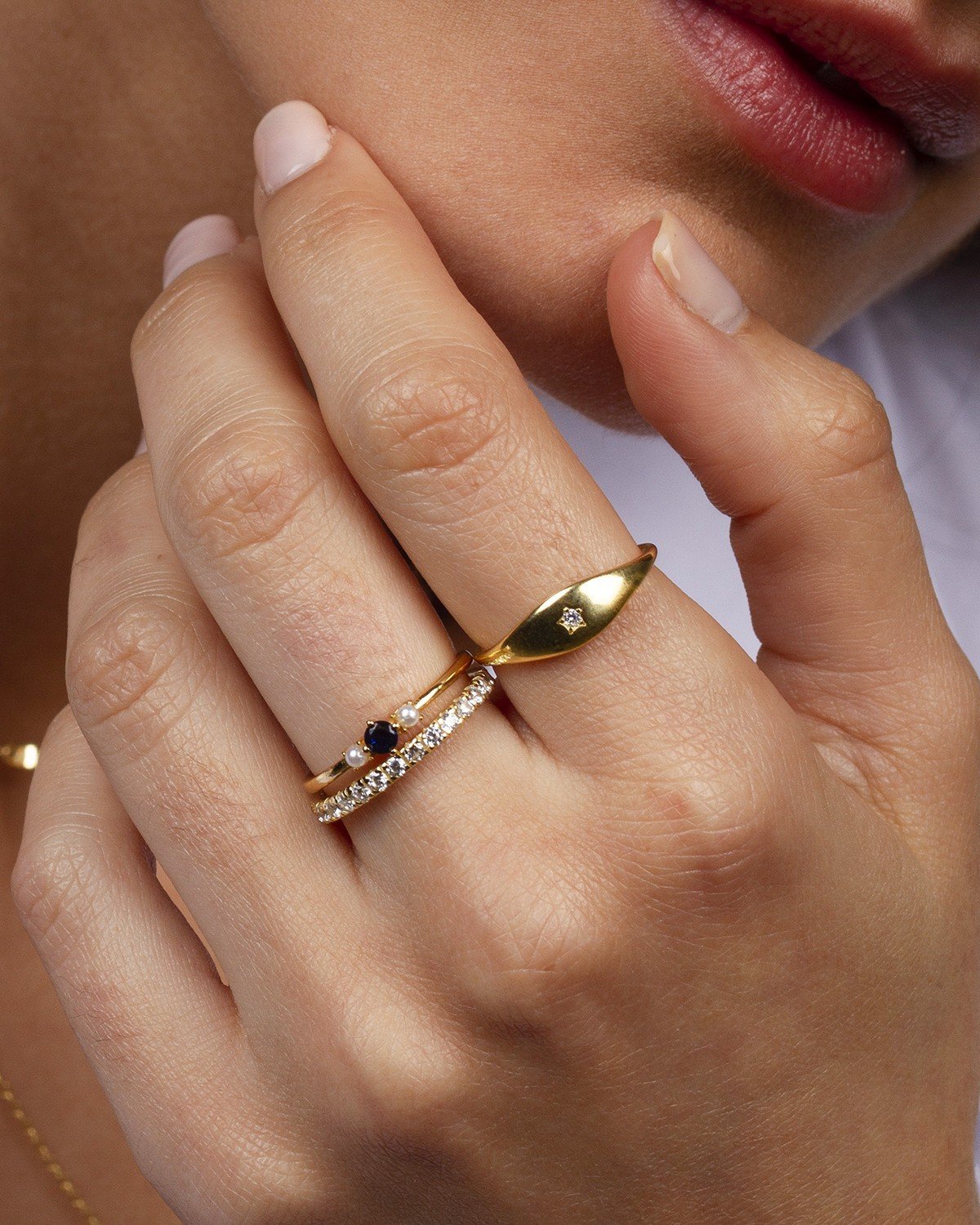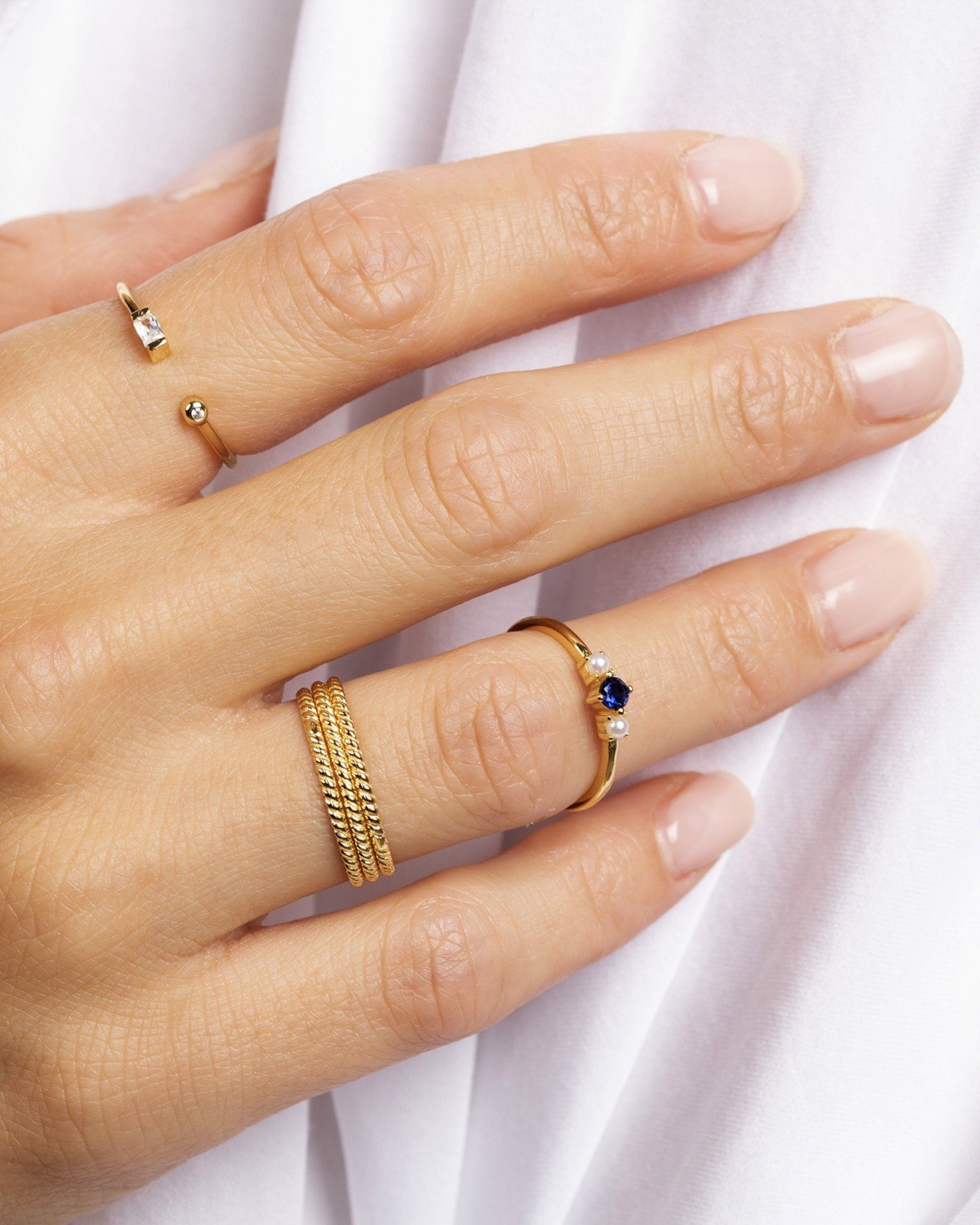 This elegant ring features a sapphire blue zirconia in the center, complemented by two natural pearls on the sides. Made from 18k gold plated sterling silver 925, it’s a unique piece that brings sophistication and distinction. Perfect for special occasions or adding a touch of elegance to your everyday look.