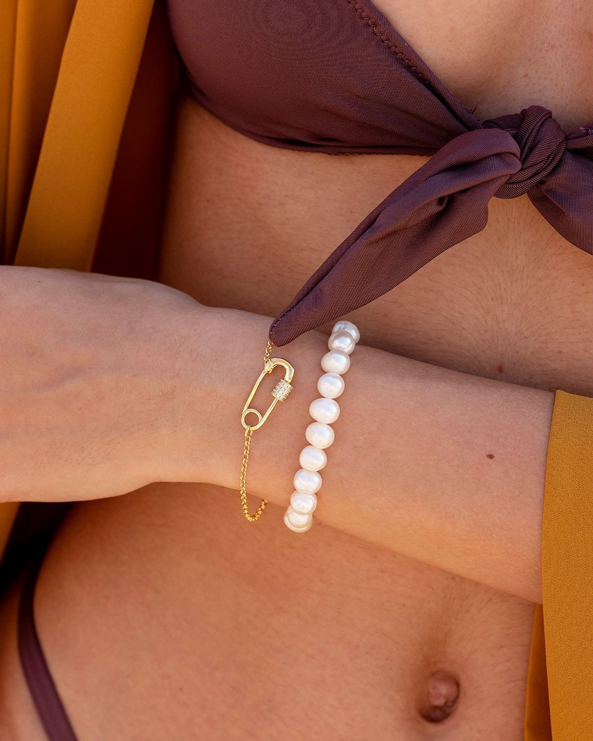 This natural pearl bracelet with a 18k gold plated 925 sterling silver clasp is a must-have accessory for lovers of delicate and versatile jewelry. Its timeless design makes it perfect for stacking with other bracelets on your wrist, creating unique and personalized looks. With a 6" + 1.2" extension length, it adapts to different sizes, ensuring comfort and a perfect fit.