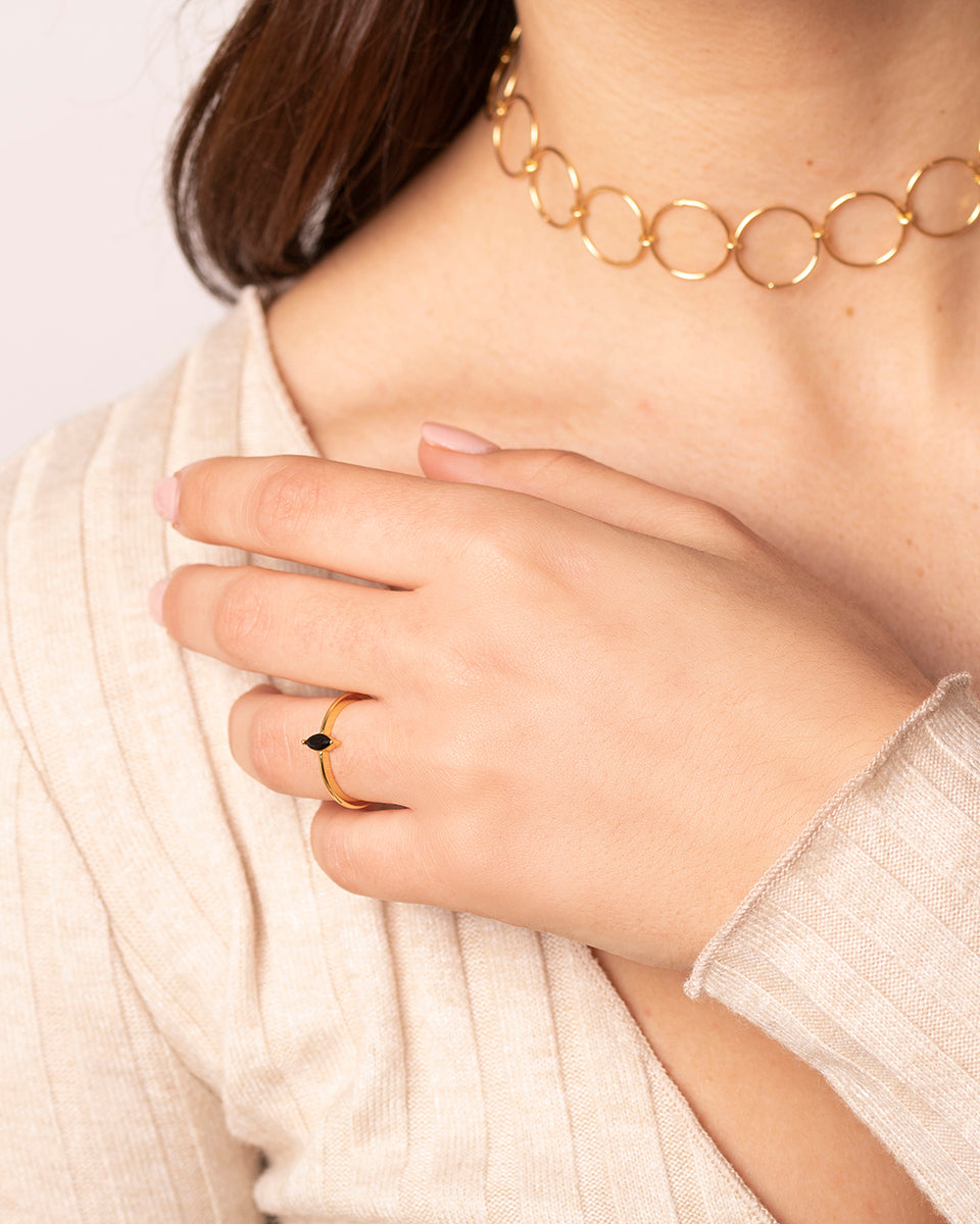 Elevate your style with our stunning 18 carat gold plated 925 sterling silver ring, featuring a black zircon in marquise cut (7x3 mm). Lightweight, nickel-free, and hypoallergenic, this minimalist ring is perfect for sensitive skin. A timeless piece that adds elegance to any outfit!