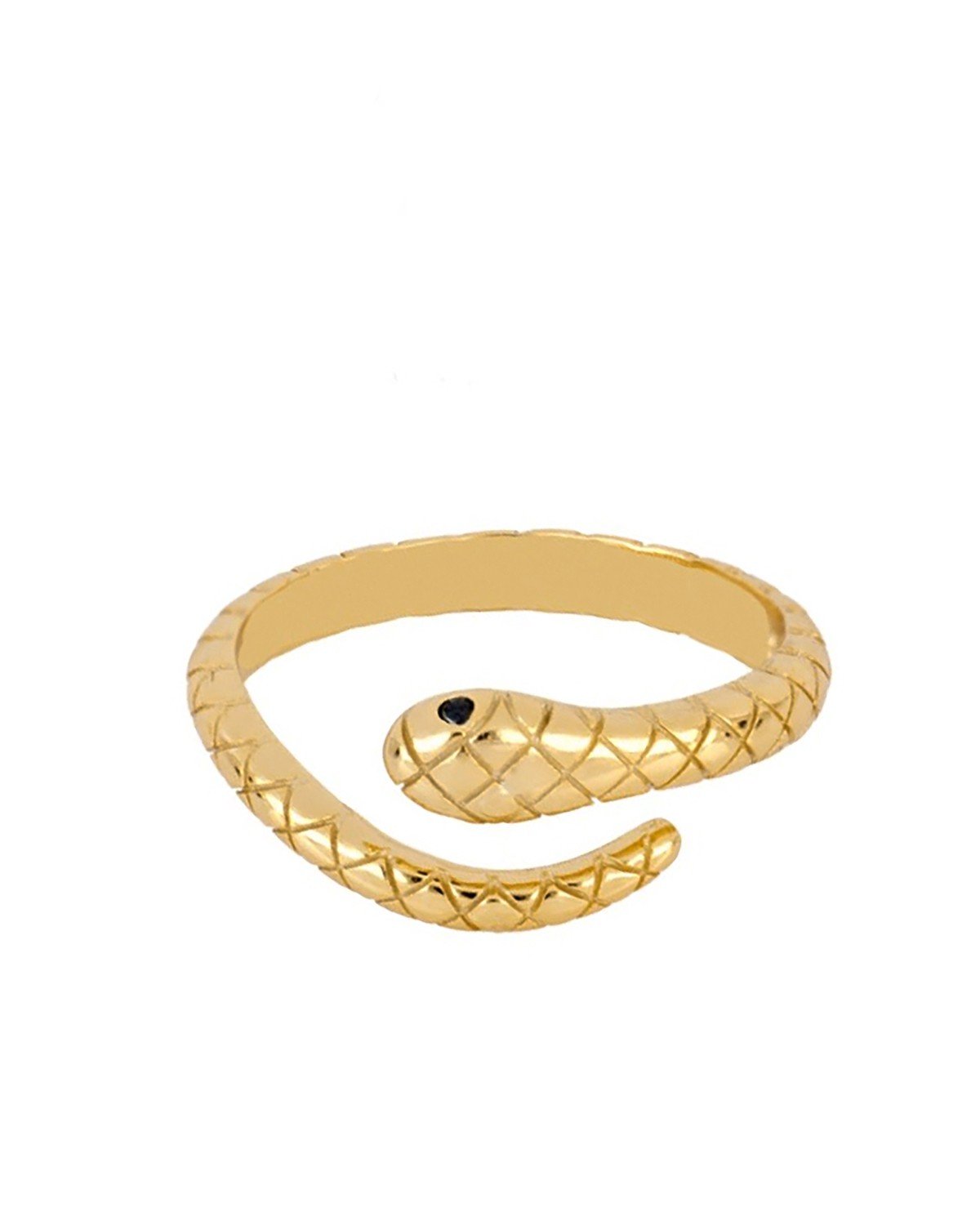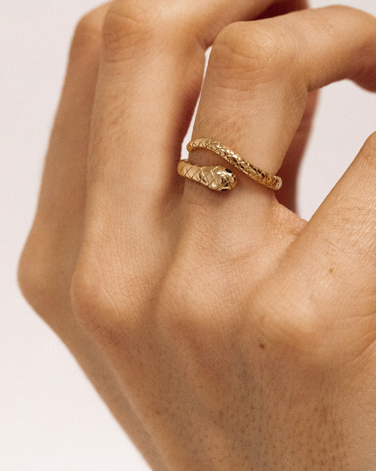 This open spiral ring features a detailed snake design that wraps elegantly around the finger, complemented by two black cubic zirconias for a touch of mystery and sophistication. Made from 18k gold plated sterling silver 925, it’s the perfect piece for those seeking a bold and distinctive accessory.