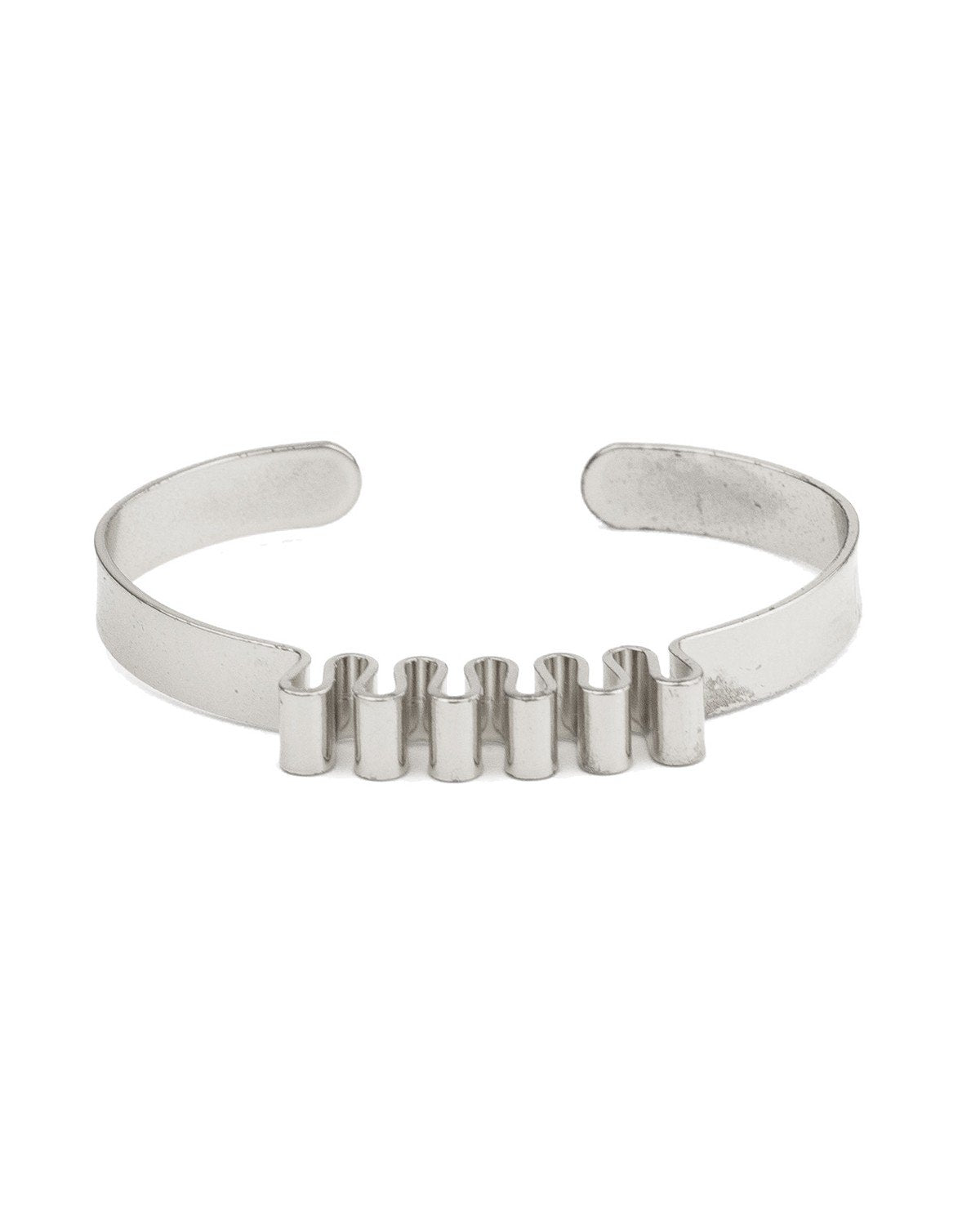 Brazalete plateado hecho en acero inoxidable. Esta pulsera abierta en la parte posterior permite llevarla cómodamente. Su tono plateado la hace perfecta como pulsera de hombre.