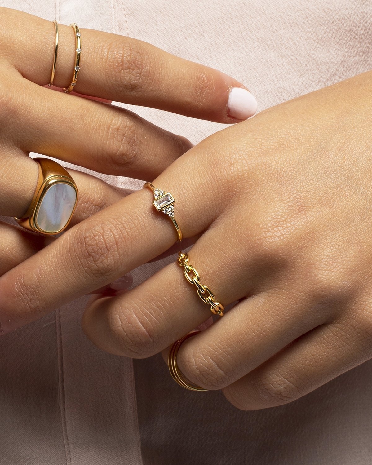 This elegant ring features a central baguette-cut zirconia flanked by six sparkling zirconias on each side, all set in 18k gold plated 925 sterling silver. Its sophisticated design makes it perfect for special occasions or to add a touch of elegance to your everyday look.