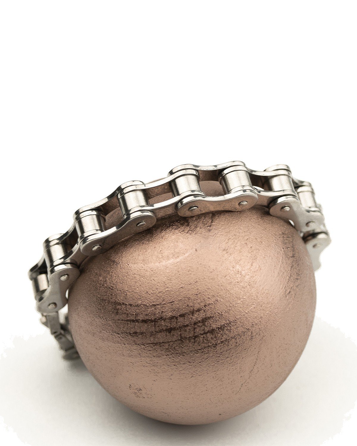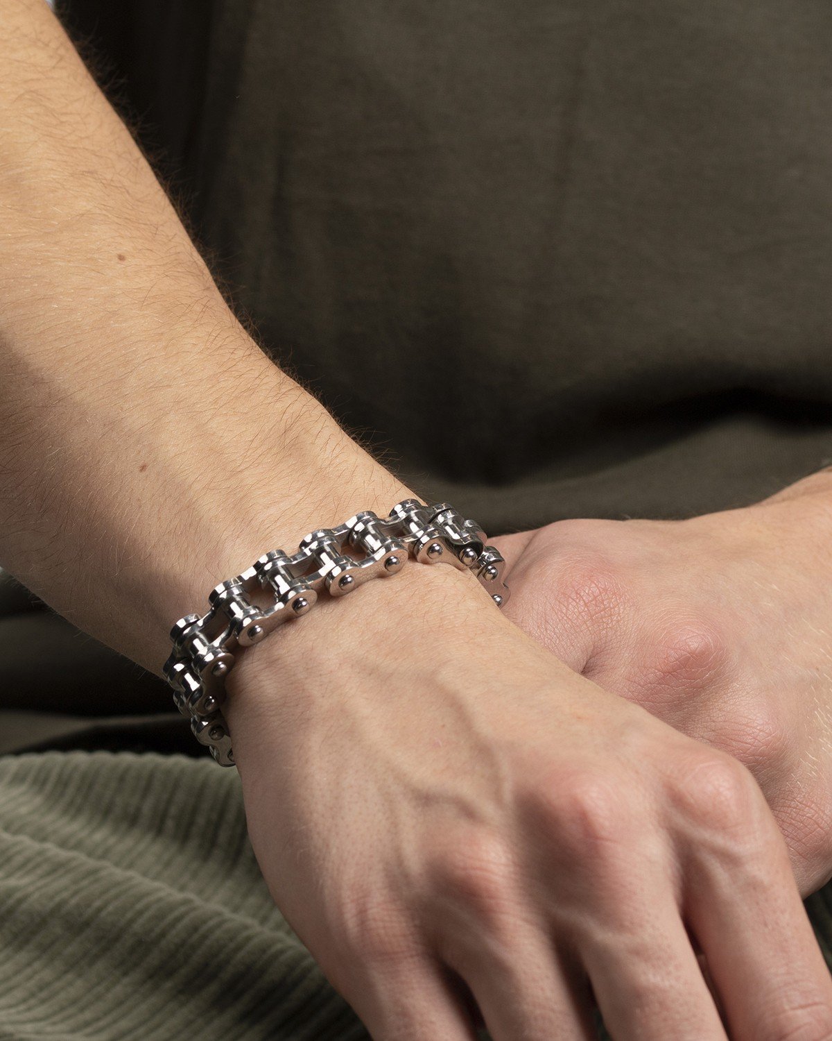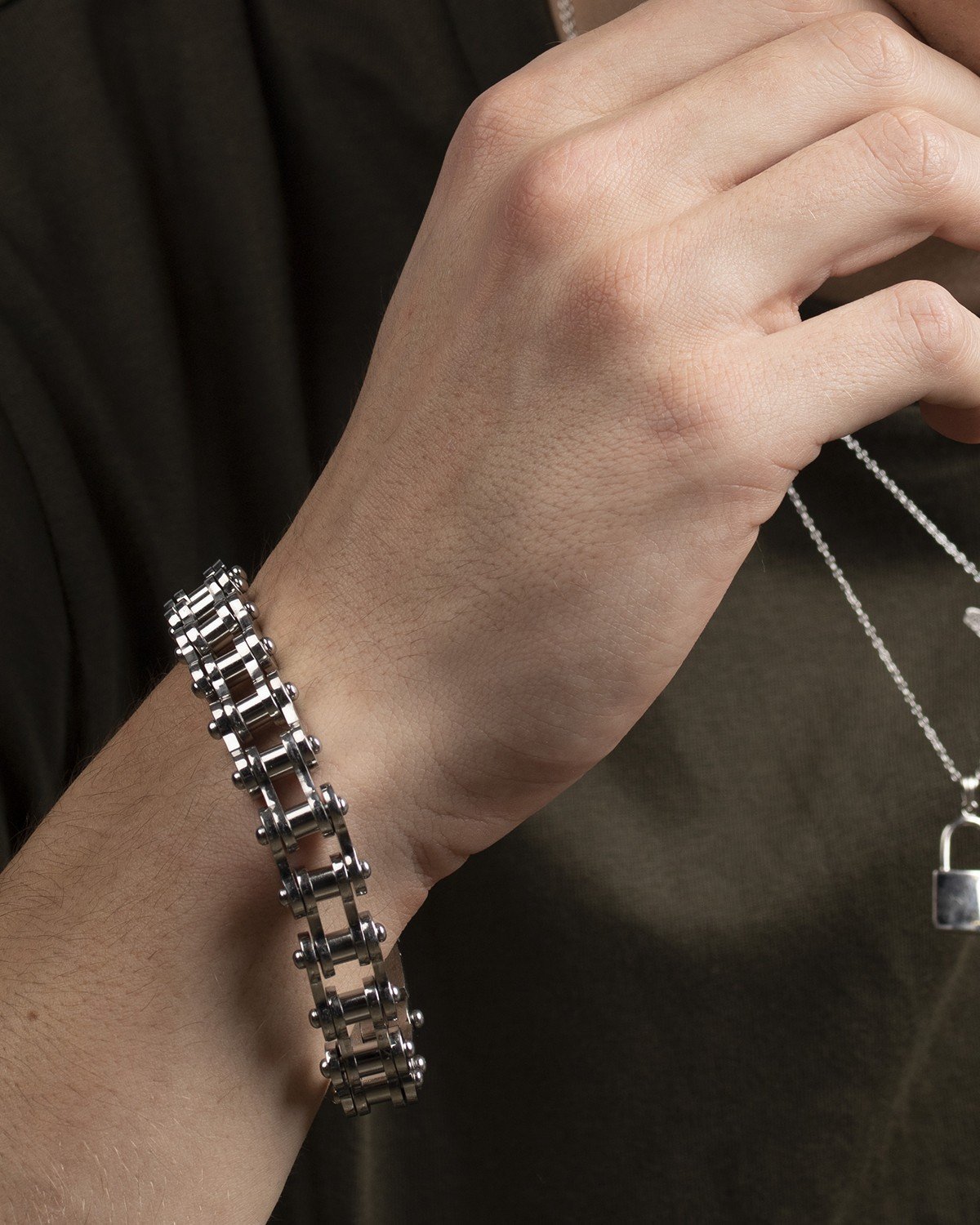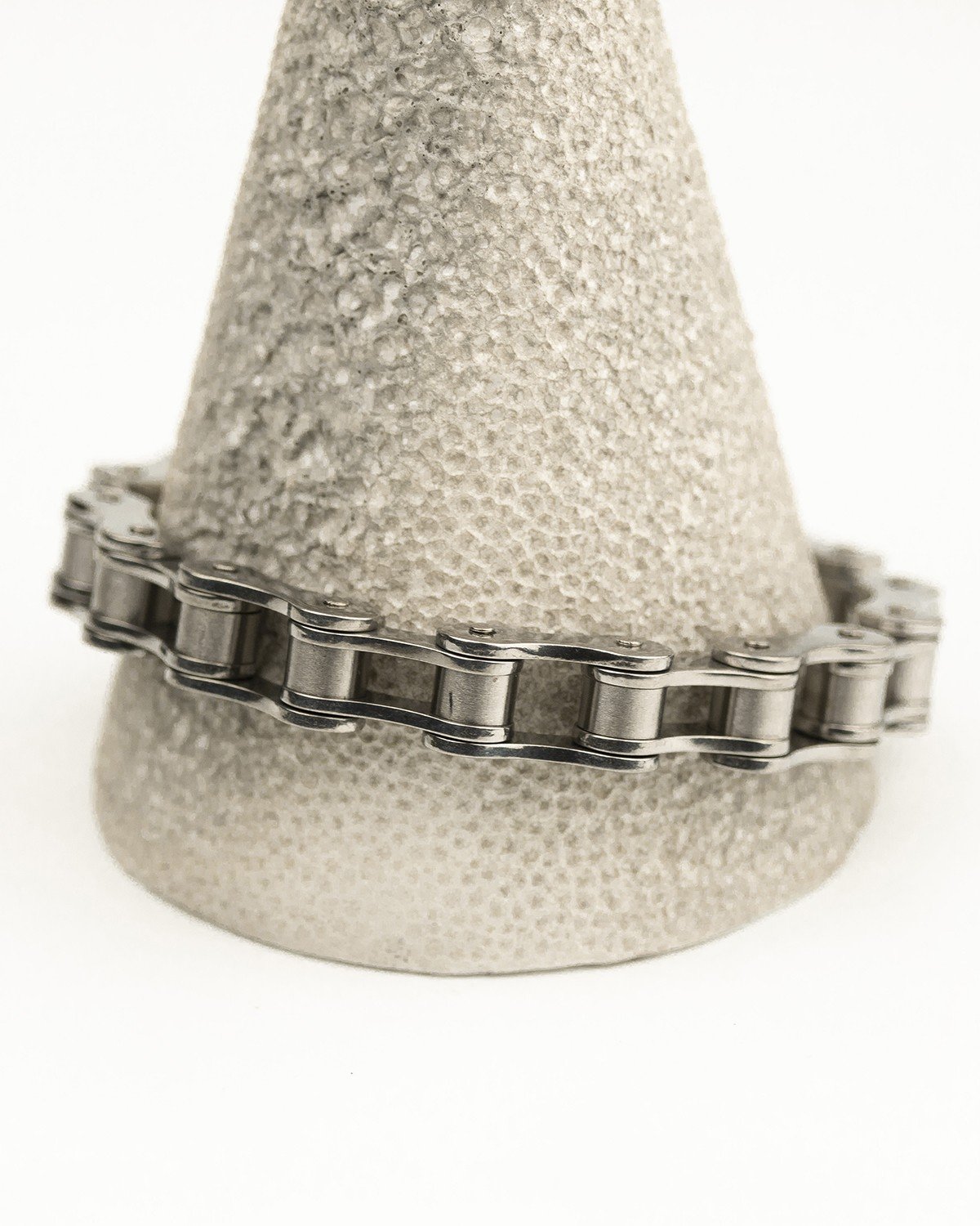 Pulsera semi-rigida con eslabones de cadena gruesa imitando a la cadena de bicicleta de acero inoxidable.
