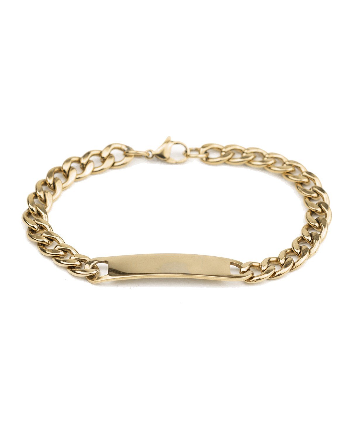 Pulsera tipo esclava con eslabones y una placa central de acero inoxidable dorado.
