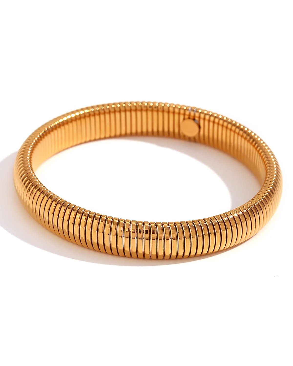 This 18k gold plated stainless steel tubogas bracelet features a 10 mm width and hidden elastic core, offering timeless appeal with contemporary wearability.