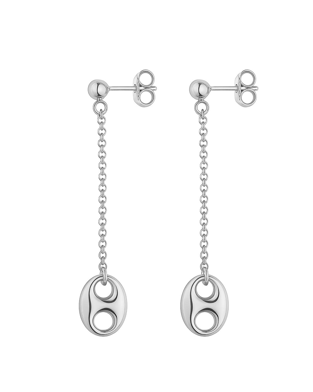 These dangle earrings feature a delicate ball, a fine chain, and a minimal link, creating a contemporary and graceful silhouette. Made from 925 sterling silver, they are hypoallergenic and nickel-free, ensuring comfort even for sensitive skin. With a 41 mm drop, these earrings add sophistication and movement to any outfit. Sold as a pair.
