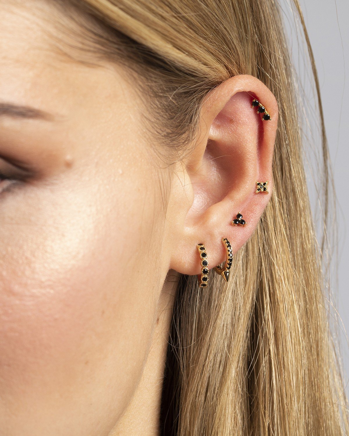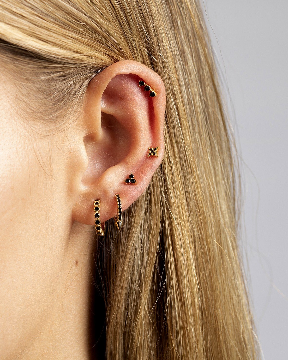 Dainty hoop earrings with black rounded cubic zirconia gemstones made of 18k gold plated 925 sterling silver. This pair of hoop earrings is a must for your everyday wear jewelry.