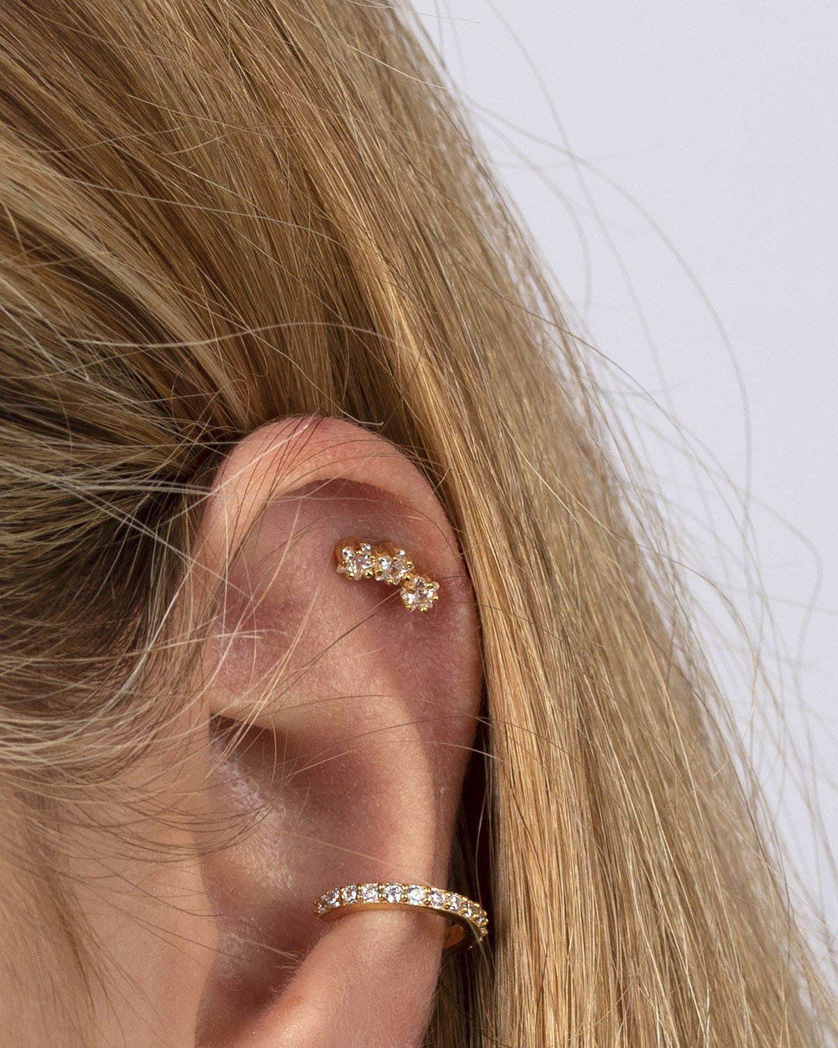 Embrace a celestial vibe with these three-star earrings adorned with sparkling zirconia, crafted from 18k gold plated 925 sterling silver. Designed for the lobe or cartilage, they offer the perfect mix of elegance and comfort.