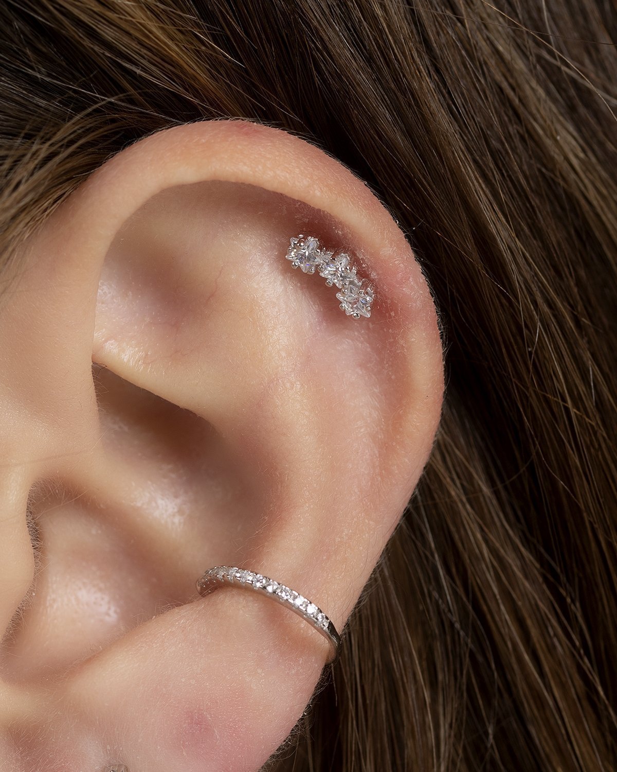 Embrace a celestial vibe with these three-star earrings adorned with sparkling zirconia, crafted from 925 sterling silver. Designed for the lobe or cartilage, they offer the perfect mix of elegance and comfort.