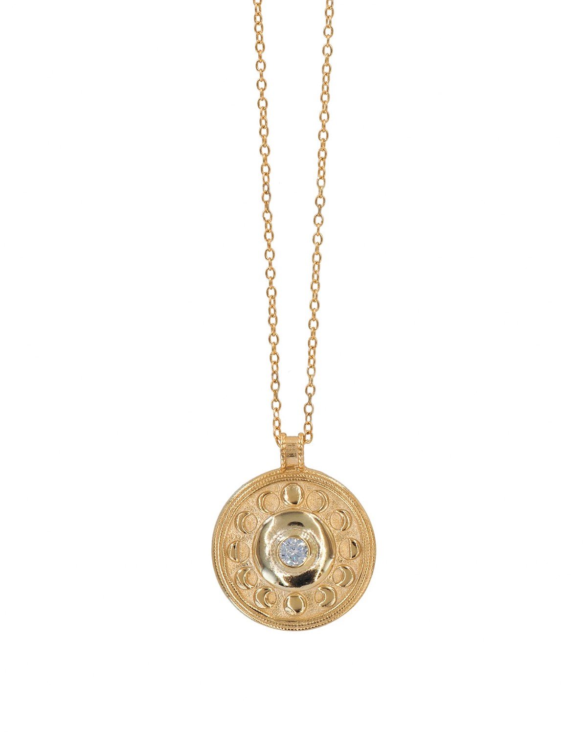 This enchanting necklace features a 20mm medal with a sparkling zirconia center encircled by detailed moon phases, crafted in 18k gold plated 925 sterling silver. The adjustable 16.5" (42cm) + 3" (8cm) chain transitions from choker to mid-length for versatile styling.