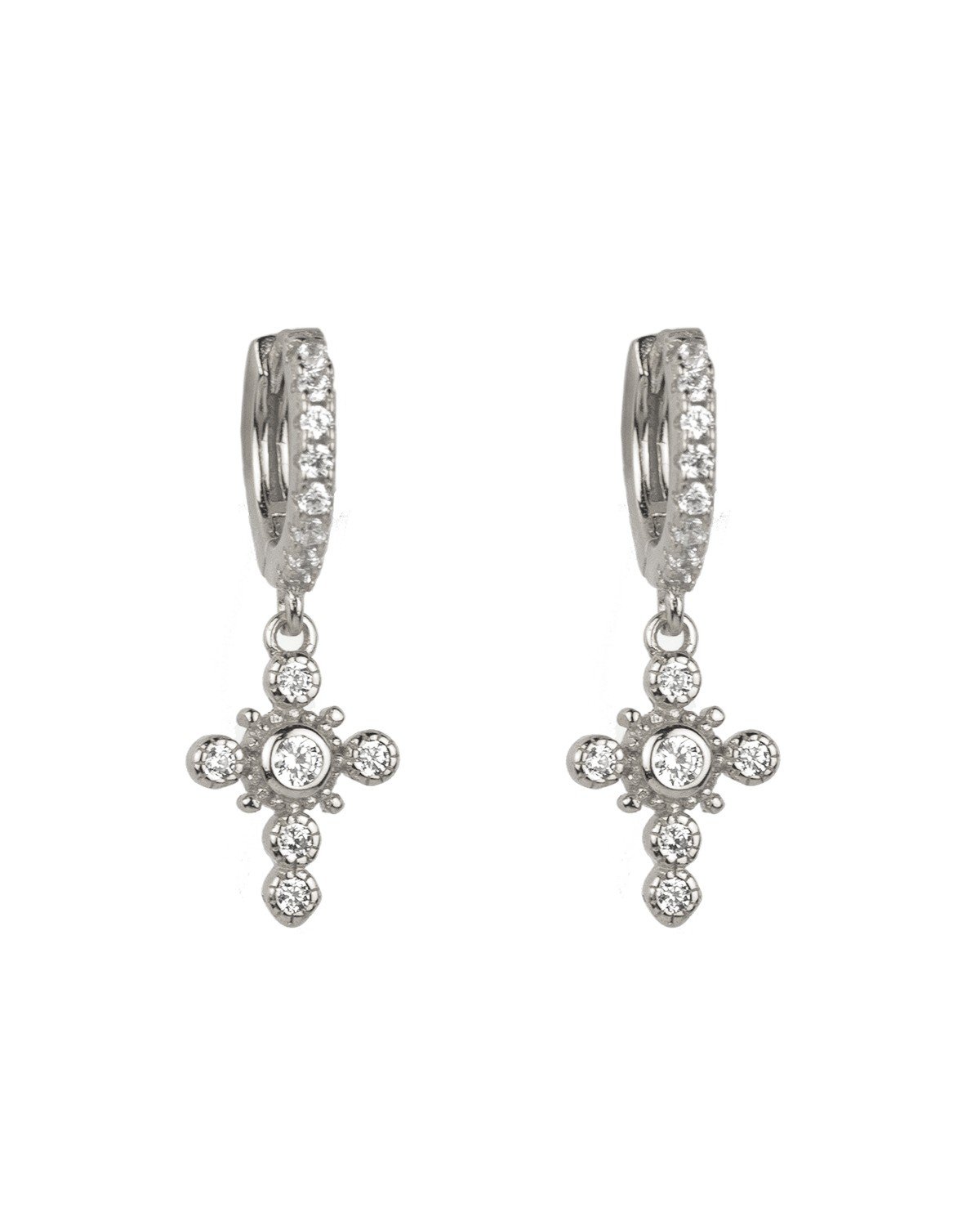 Hoop design with a cross pendant and sparkling zirconia stones.