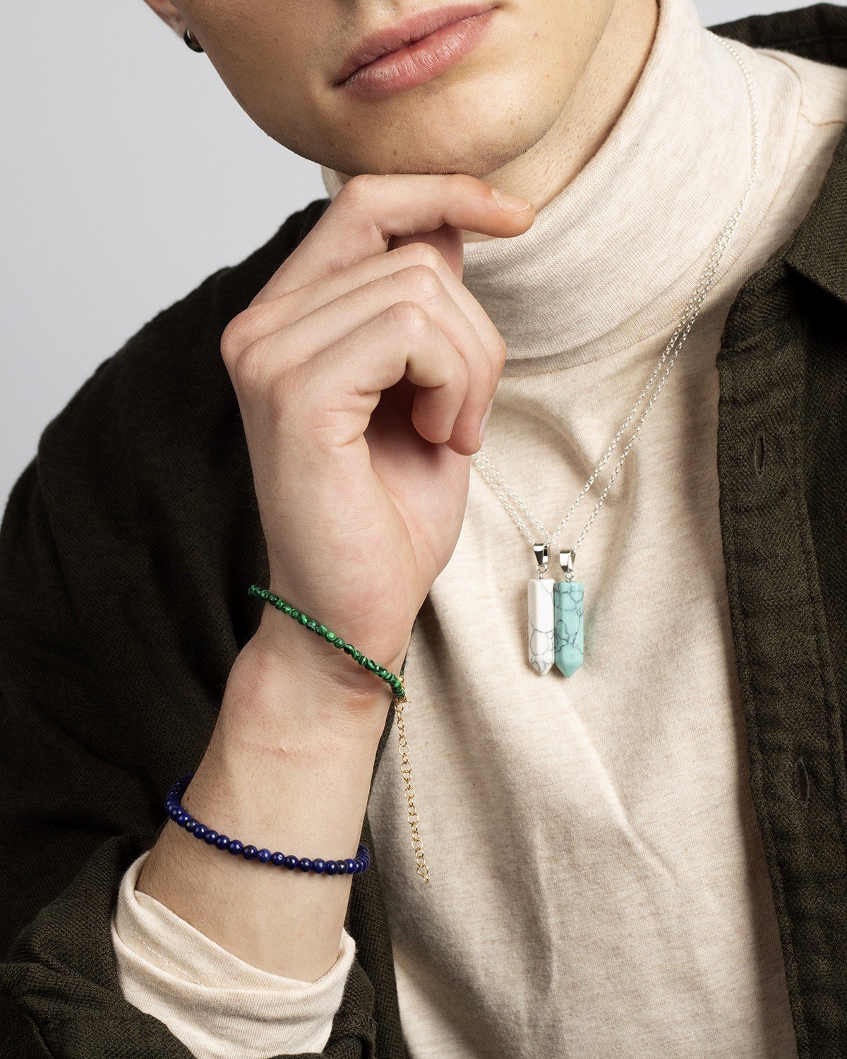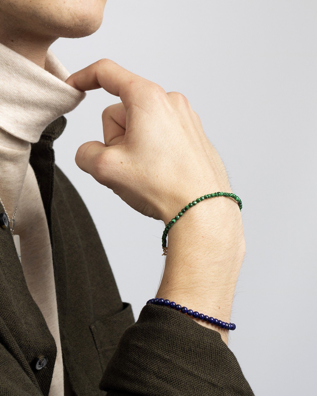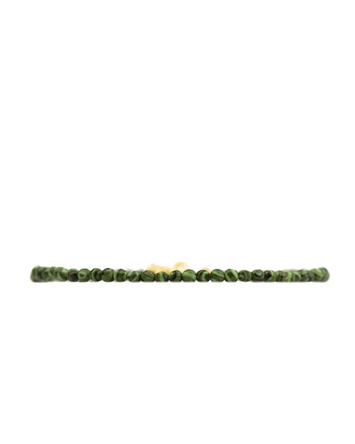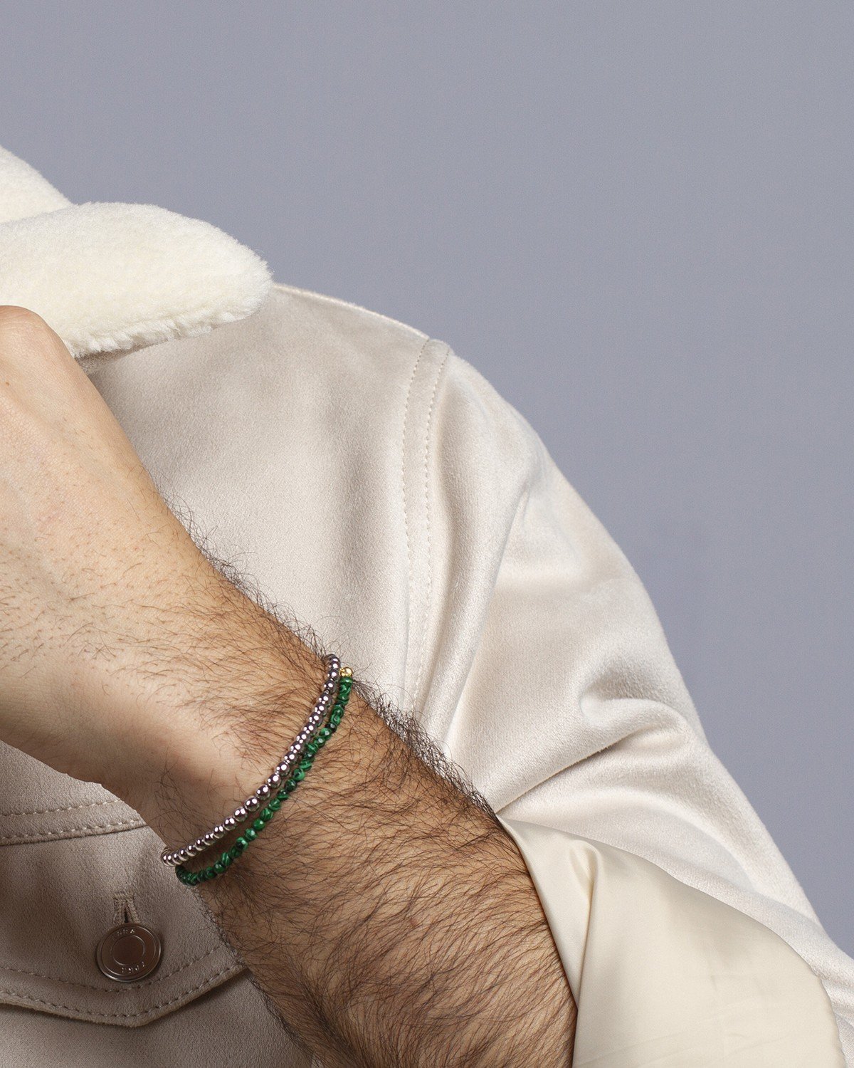 Pulsera con pequeñas bolas de mineral malaquita hecha en seda y plata de ley 925.