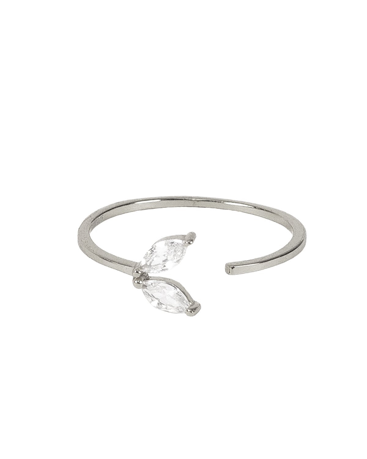 This floral open ring features two brilliant marquise-cut cubic zirconias at the center. Made from 925 sterling silver, the design is elegant and delicate, perfect for those seeking a sophisticated and modern piece. Its slightly adjustable structure allows it to comfortably fit different finger sizes.