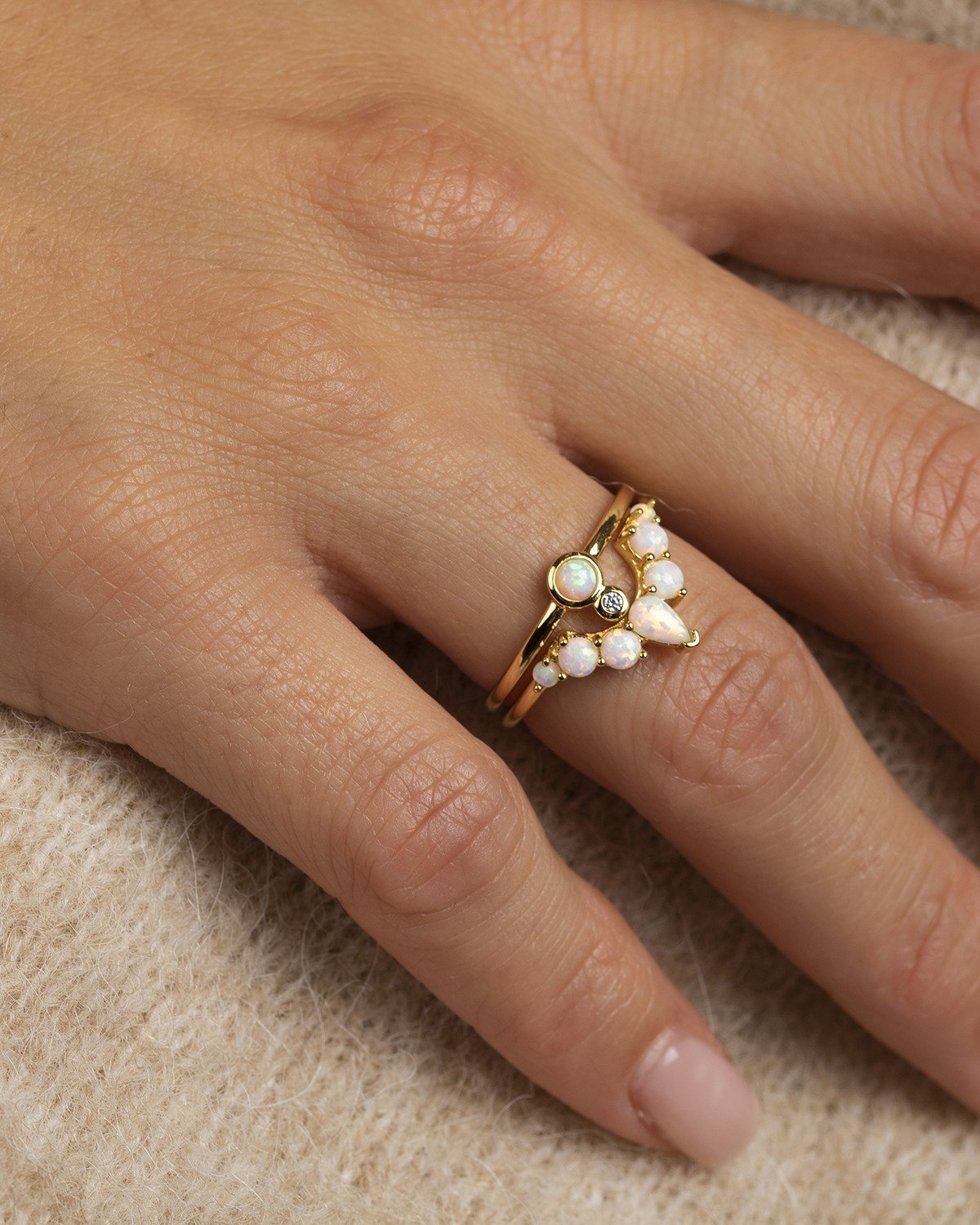 This elegant ring features a natural opal paired with a brilliant cubic zirconia, creating a design that stands out for its beauty and simplicity. Crafted in 18 carat gold plated sterling silver 925, it's a versatile piece, perfect for wearing alone or stacking with other rings to create a unique look.