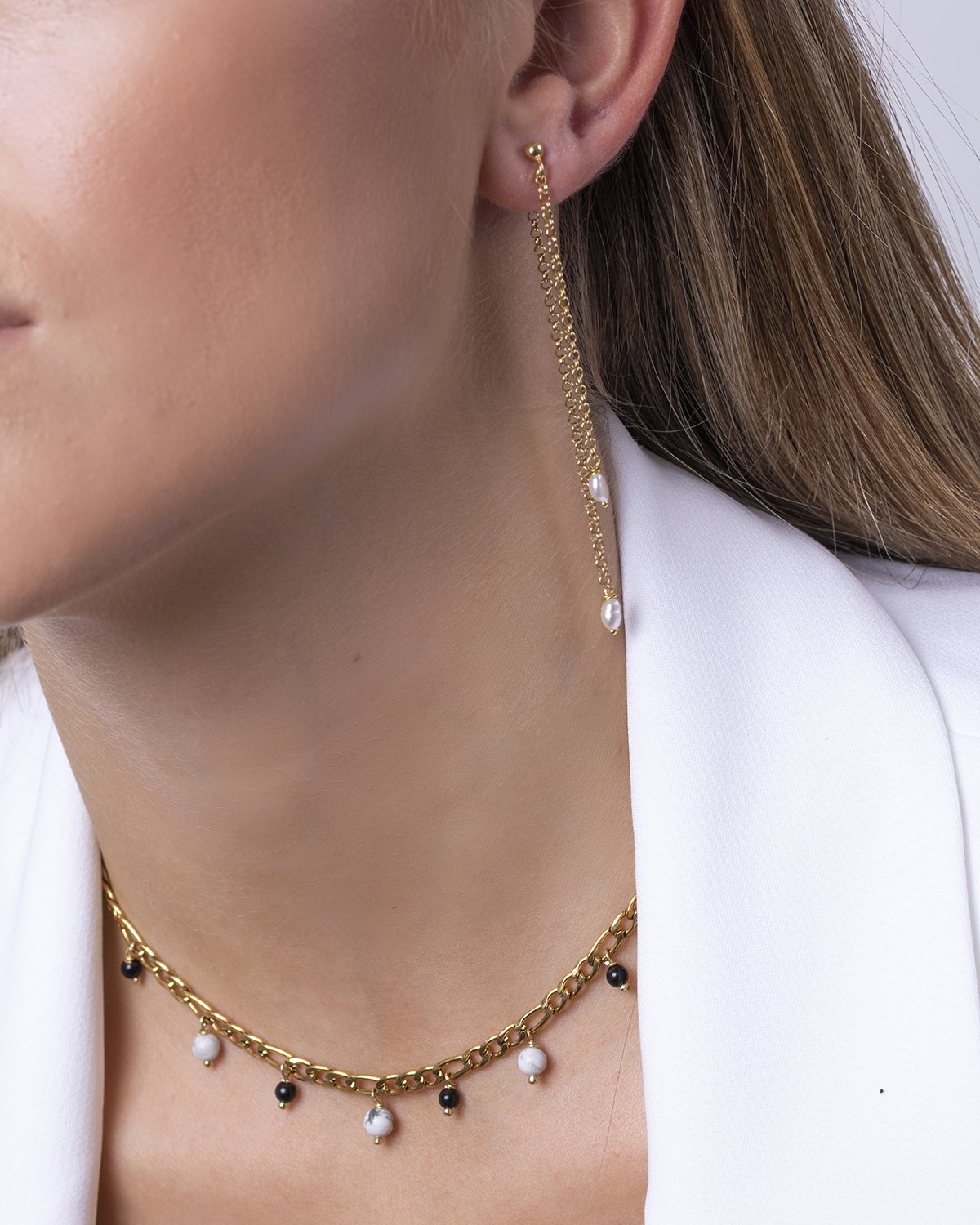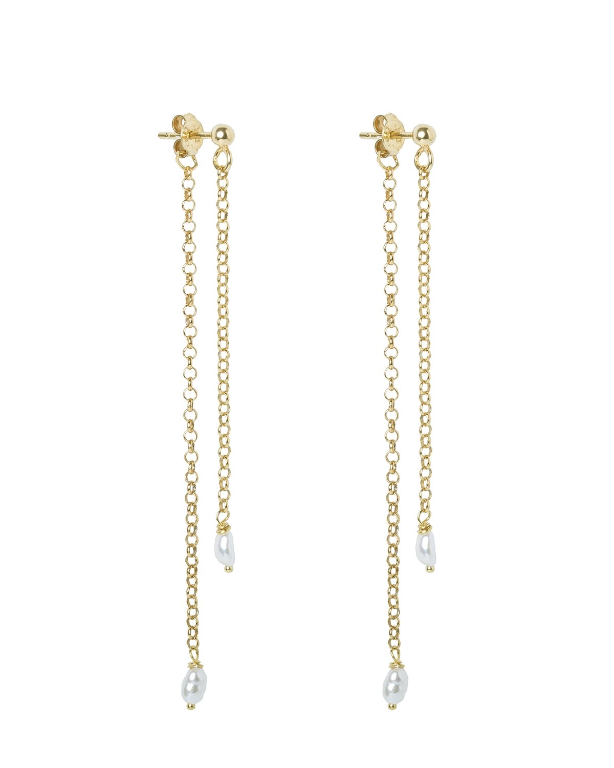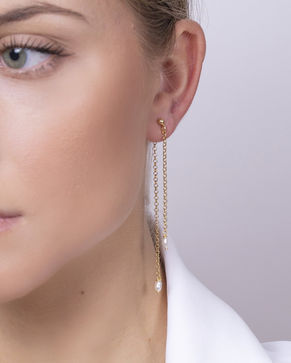 Party pearl is a pair of ball stud earrings with two dangling chains and freshwater pearls made of 18 carat gold plated 925 sterling silver. This party earrings are perfect for a special occasion.