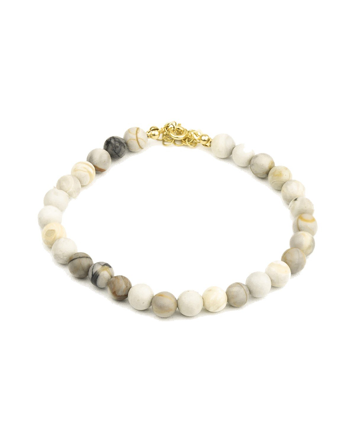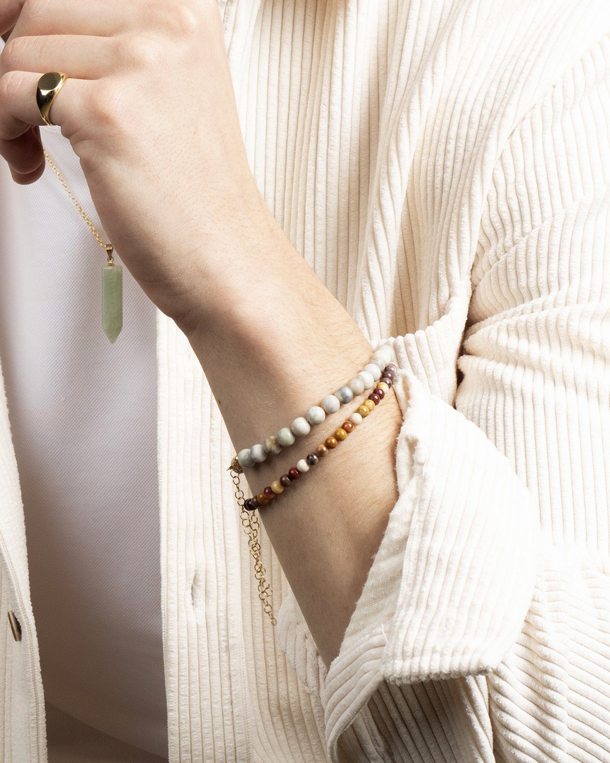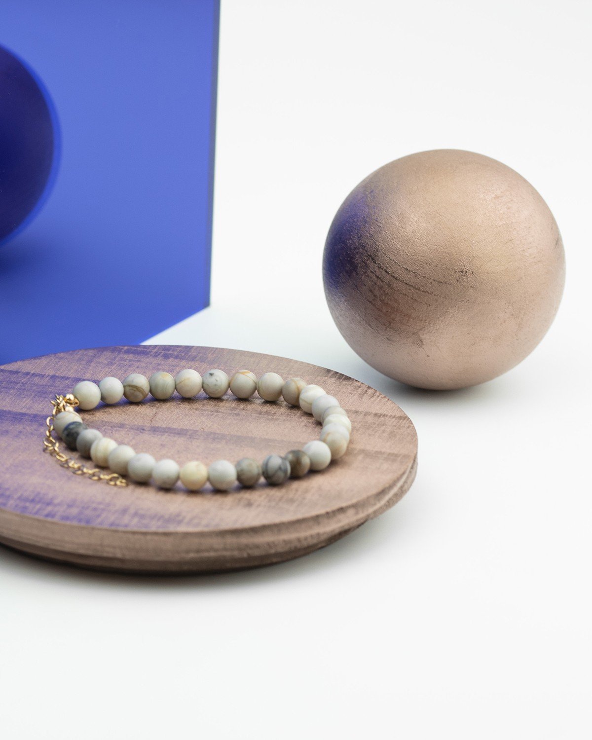 Pulsera con pequeñas bolas de minerales naturales hecha en seda y plata de ley 925.