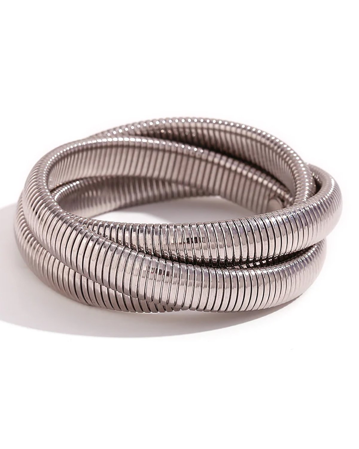 This rhodium-plated 316L stainless steel bracelet features three interlocked tube gas bands with invisible elastic core, offering shine and durability for active lifestyles.