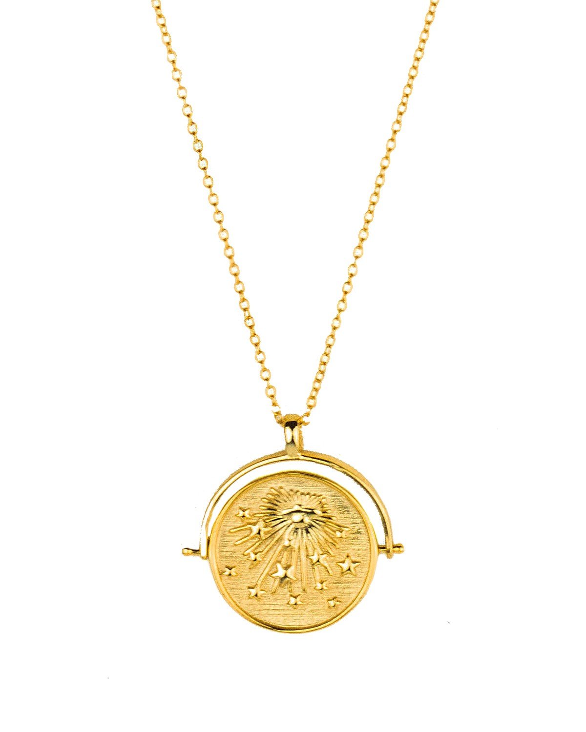 This unique necklace merges vintage inspiration and minimalist design with a spinning charm featuring astronomical motifs (satellites and planets) in 18 carat gold plated 925 sterling silver. Customize with two sizes and three chain lengths: