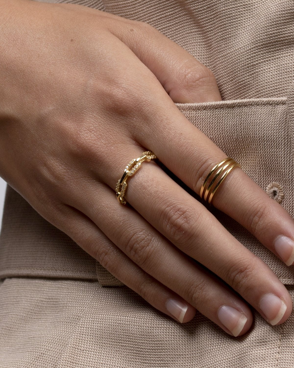 This elegant chain-style ring is adorned with a delicate pavé of brilliant cubic zirconia, crafted in 18 carat gold plated sterling silver 925. Its unique design combines modern style with a touch of luxury, making it perfect to wear alone or stack with other rings.