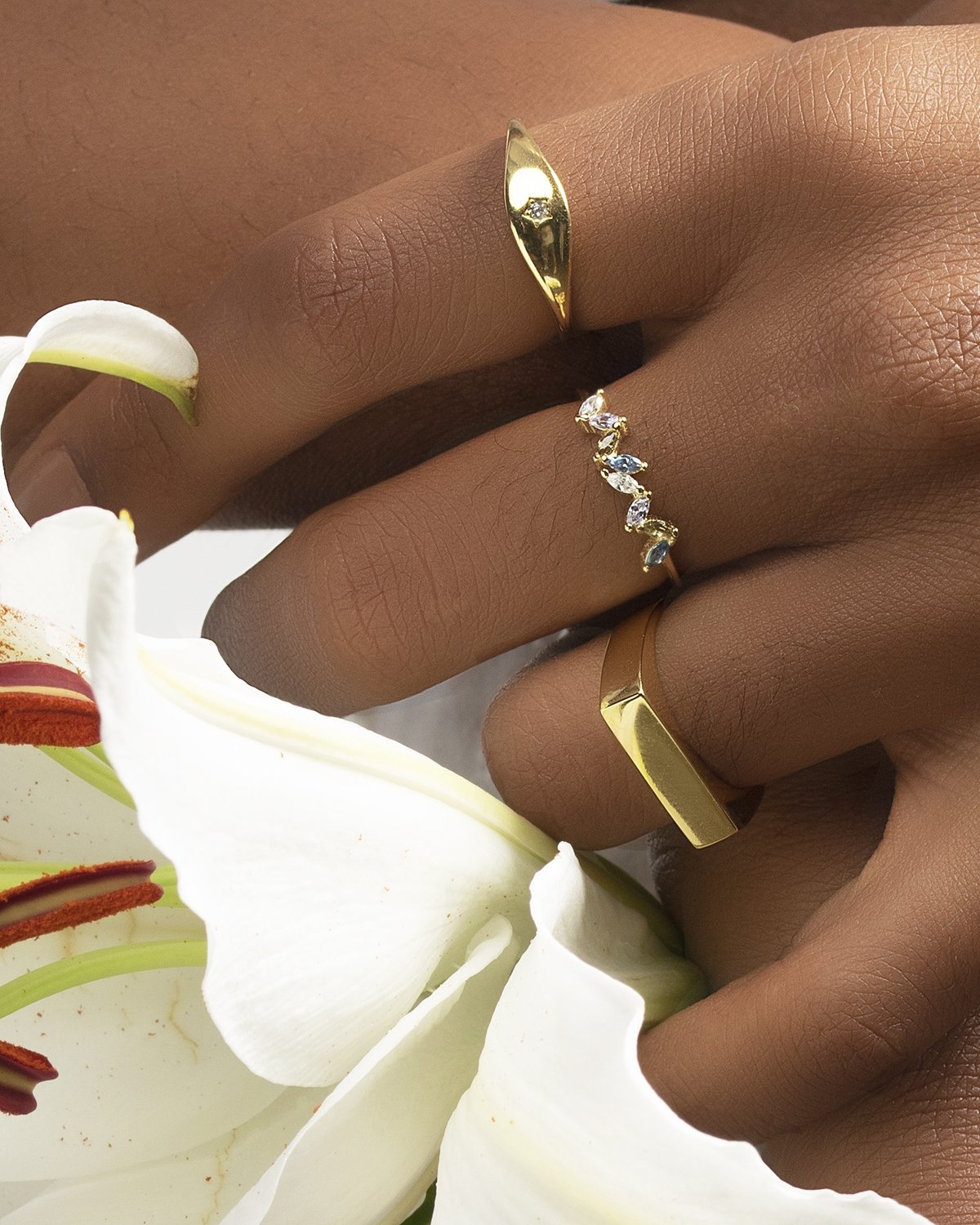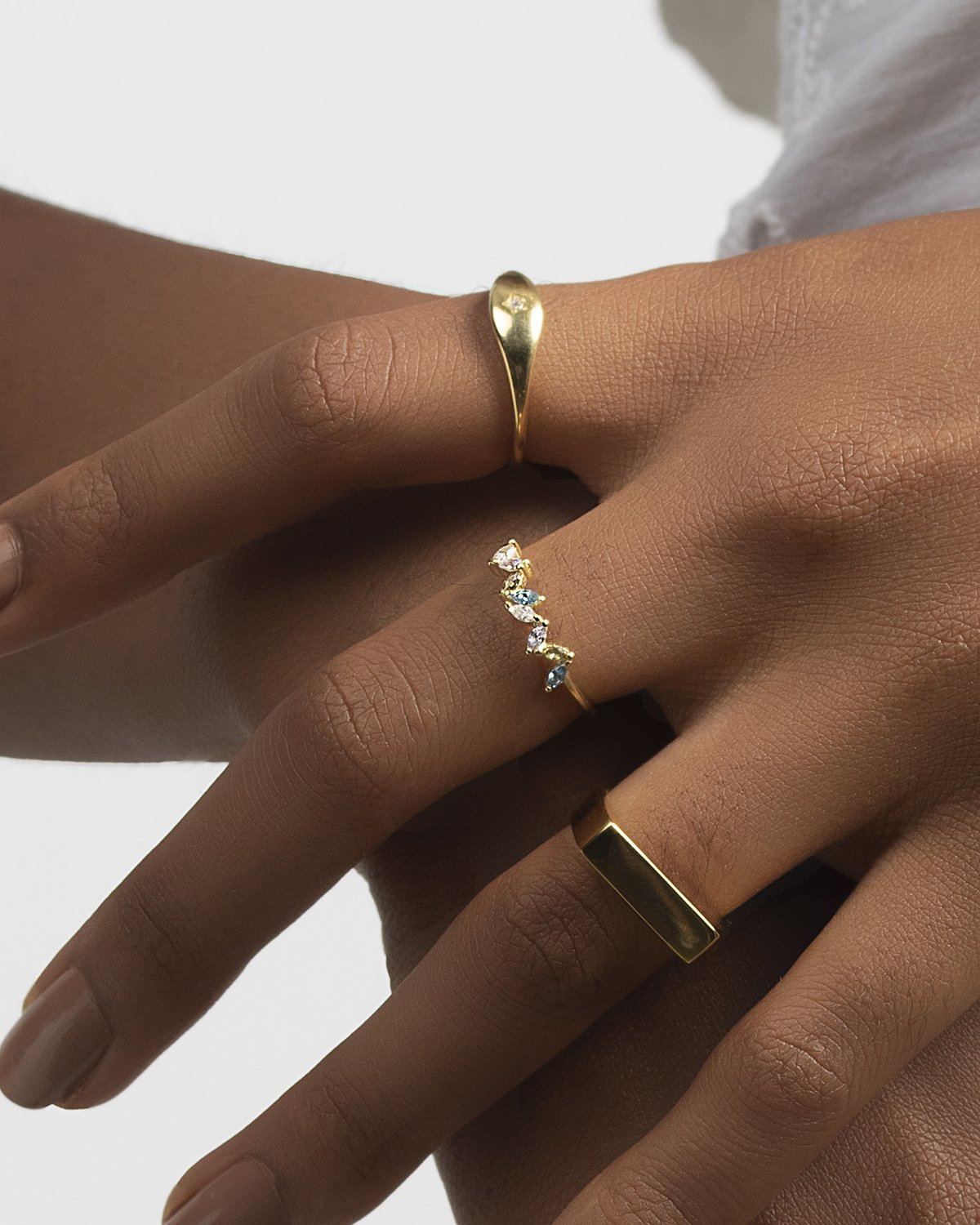 The Silvester Gold ring is an elegant and vibrant piece, adorned with small multicolored marquise-cut cubic zirconias. Made from 18 carat gold plated 925 sterling silver, this ring is perfect for those seeking a touch of color and sophistication in their style. Ideal for special occasions or adding a unique touch to your daily look.