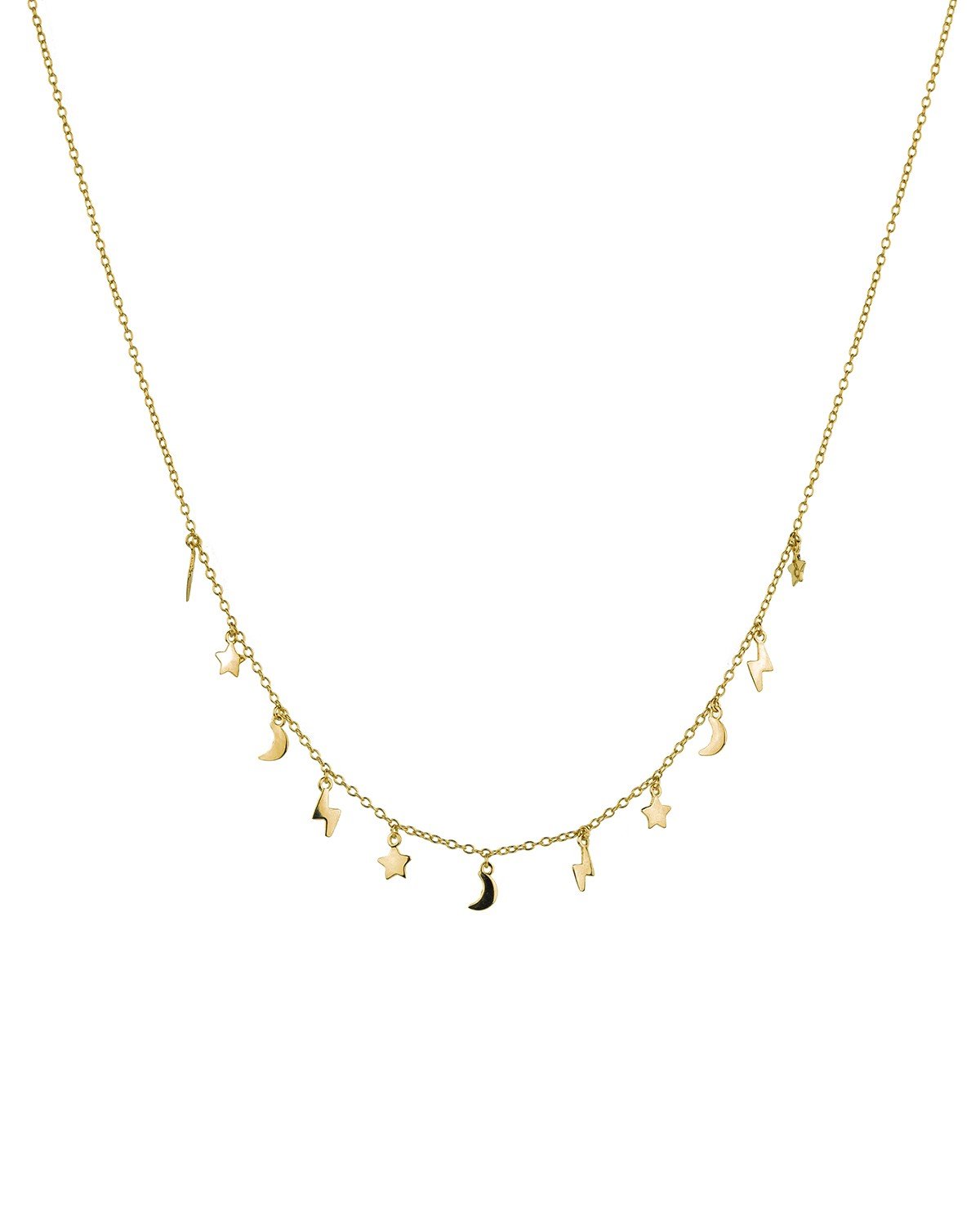 This beautiful 18k gold plated 925 sterling silver choker features 11 dangling charms shaped as stars, moons and lightning bolts, creating a meaningful celestial design. The 13.8" (35cm) + 2.8" (7cm) extension chain ensures a perfect fit.
