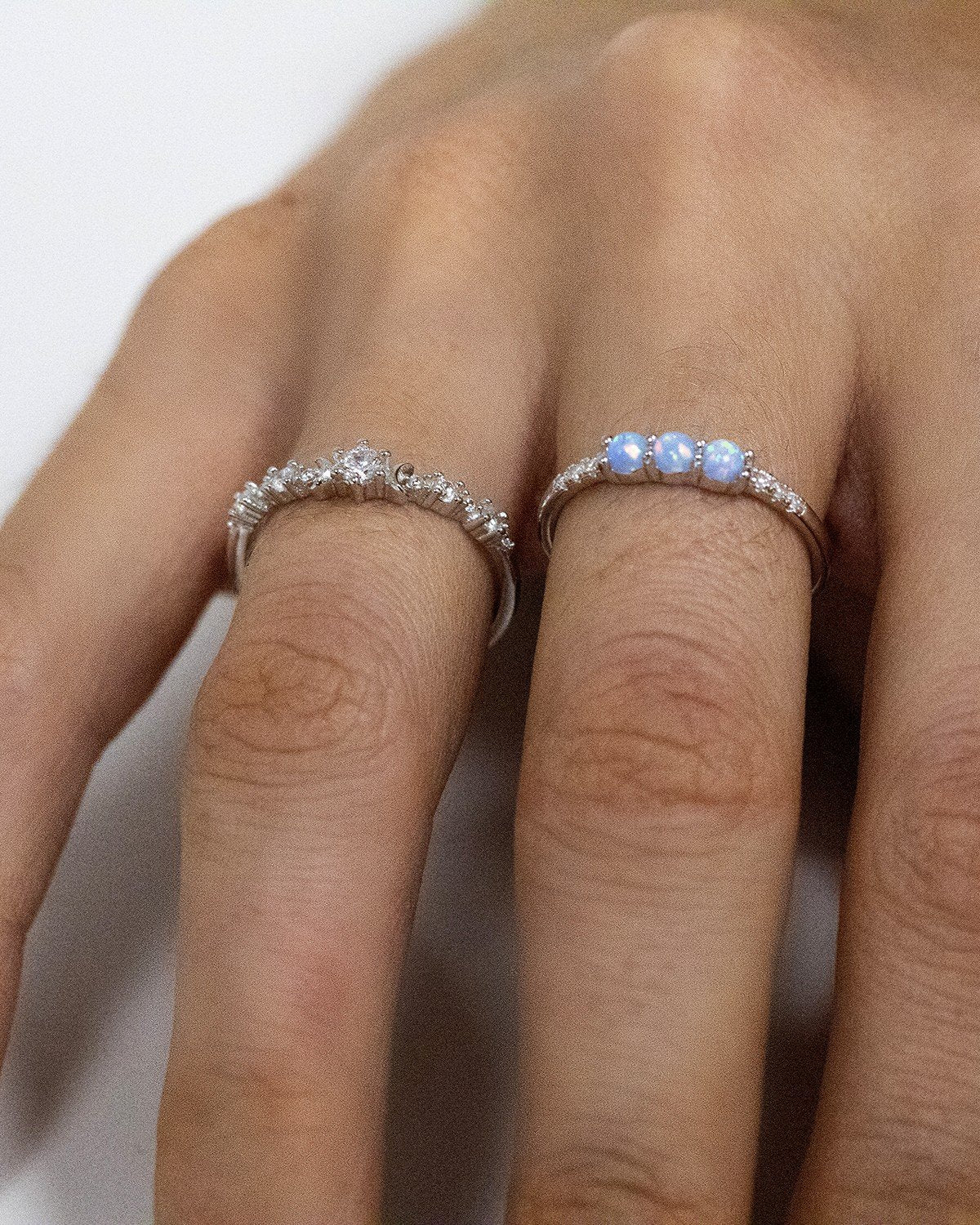 This sophisticated ring features three blue opal stones surrounded by sparkling cubic zirconias, creating a striking and elegant design. Made of sterling silver 925, it is the perfect piece to complement any look, whether casual or formal.