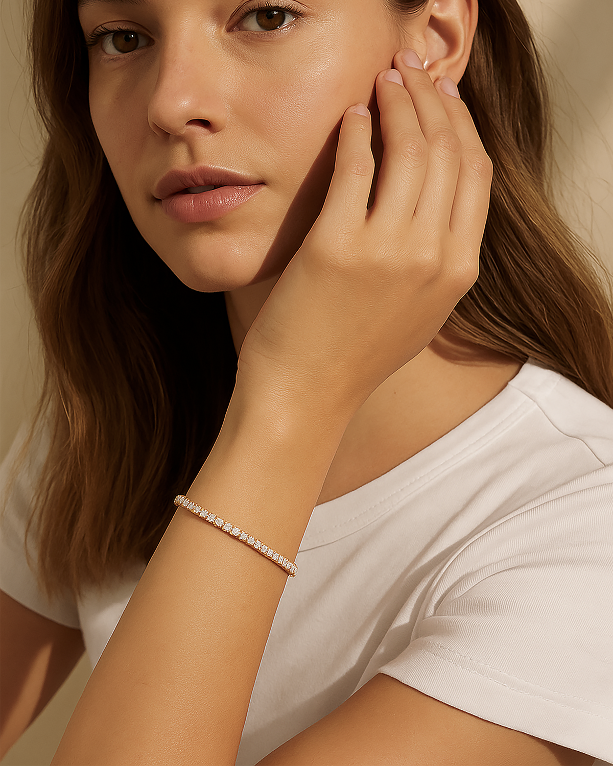 Add a touch of golden elegance to your everyday look with this 18K gold-plated rivière bracelet. Crafted from 925 sterling silver and set with radiant cubic zirconia stones, this bracelet combines classic luxury with modern comfort. Hypoallergenic, nickel-free, and lightweight — it's made to shine day or night.