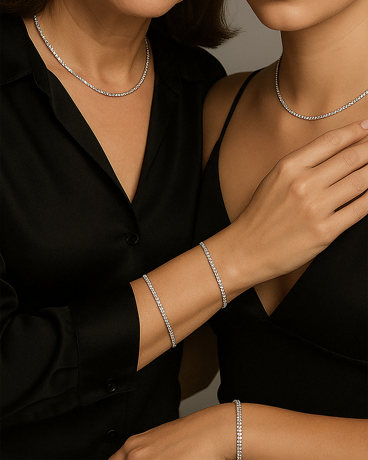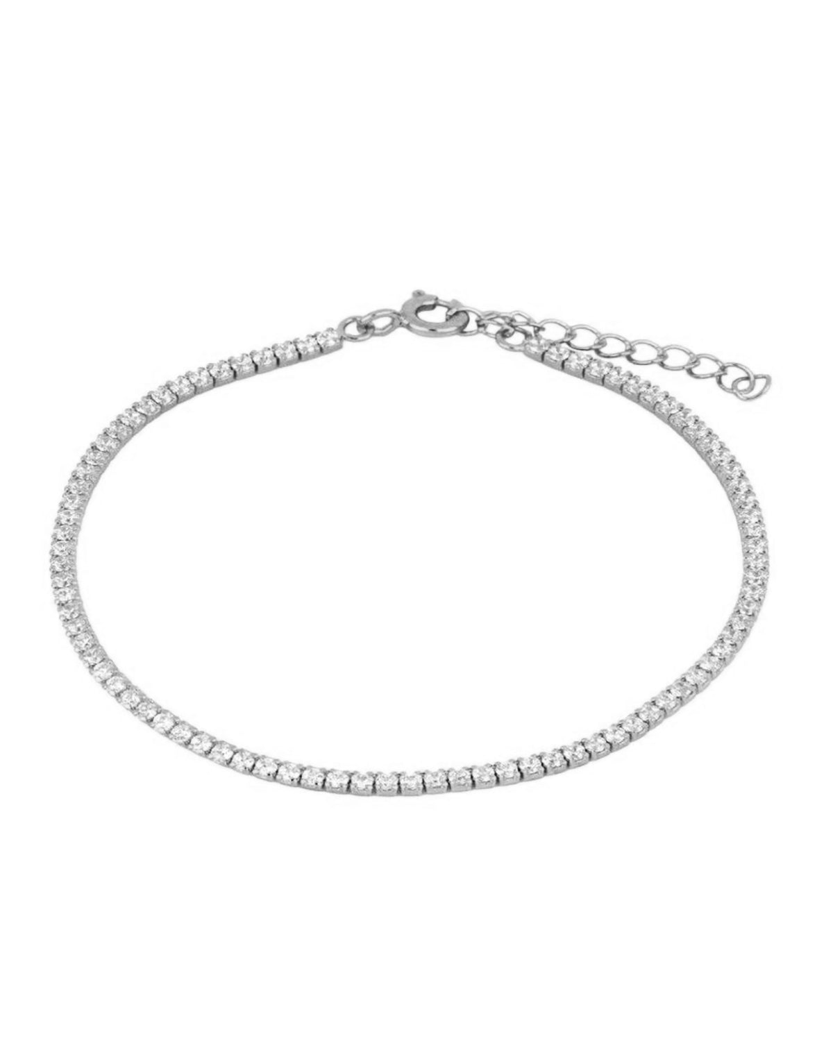 Timeless elegance meets modern comfort with this delicate rivière bracelet crafted from 925 sterling silver. Adorned with brilliant-cut cubic zirconia stones, it offers the refined sparkle of diamonds without compromising on comfort. Hypoallergenic and nickel-free, this piece is designed for everyday luxury.