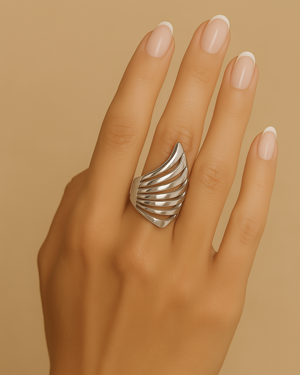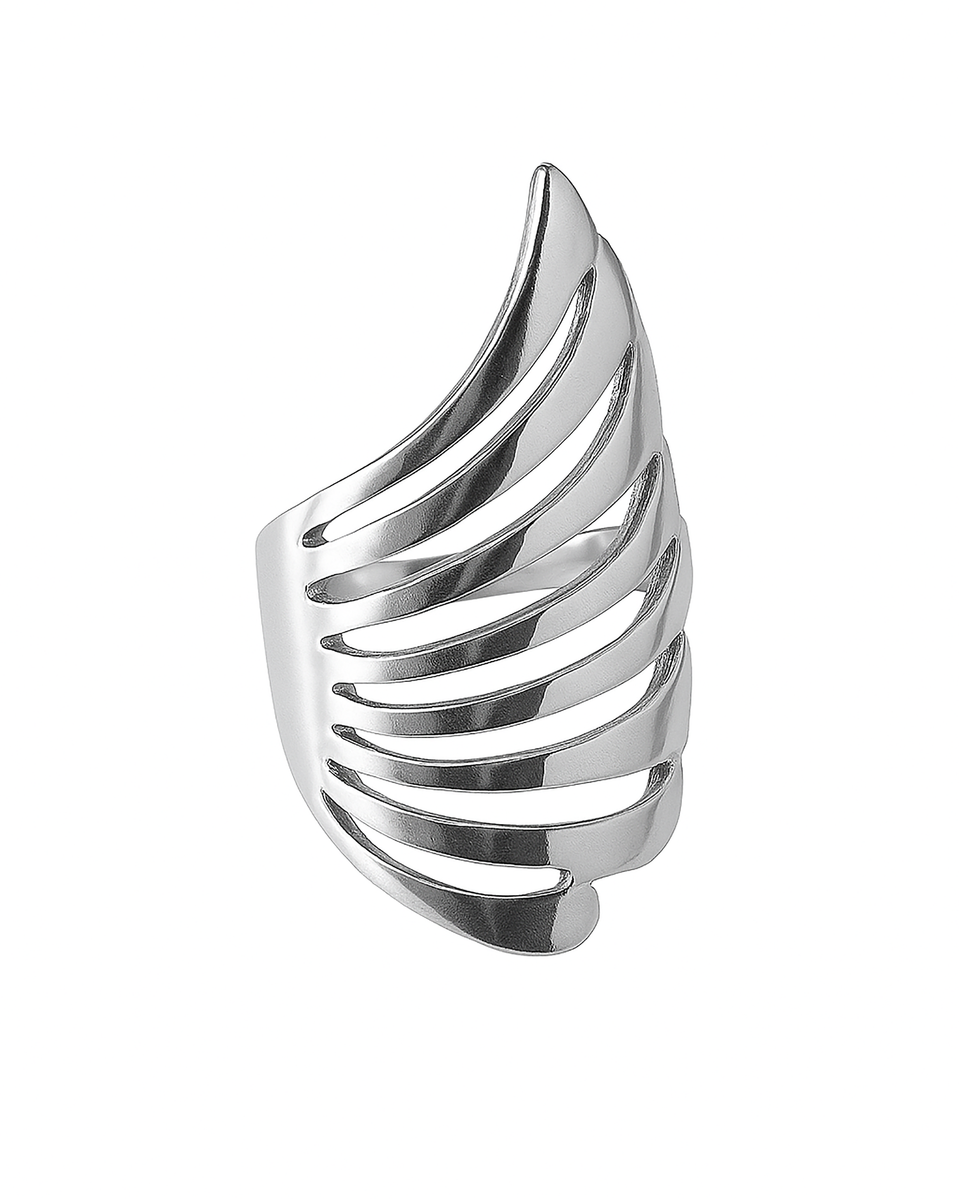Soar with style wearing this stunning wing-shaped statement ring, crafted in hypoallergenic, nickel-free 925 sterling silver. Its open-back design makes it fully adjustable to any finger size, perfect for stacking or wearing solo. The delicate yet bold wing detail adds a touch of ethereal elegance, making it an eye-catching addition to your jewelry collection.