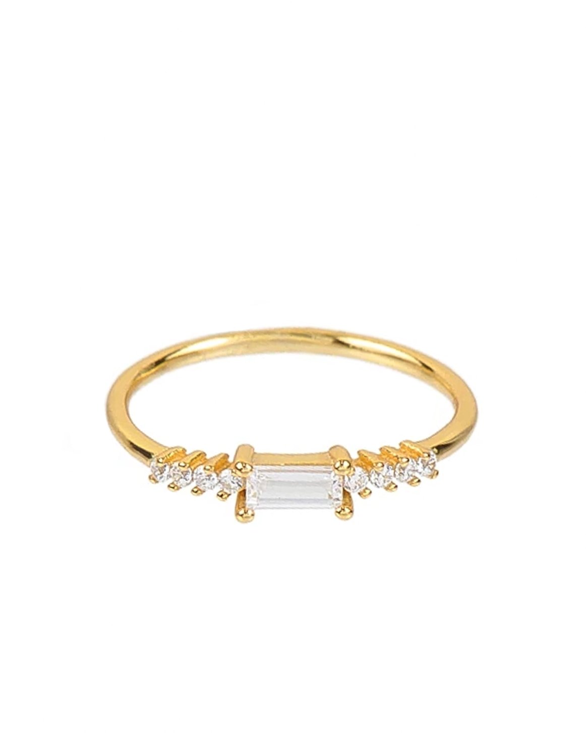 Cette élégante bague en argent sterling 925 plaqué or 18 carats est ornée d'une zircone centrale taille baguette qui ajoute un design moderne et sophistiqué. La zircone cubique ronde des deux côtés ajoute un éclat supplémentaire, ce qui la rend parfaite pour toutes les occasions, qu'elles soient quotidiennes ou spéciales.