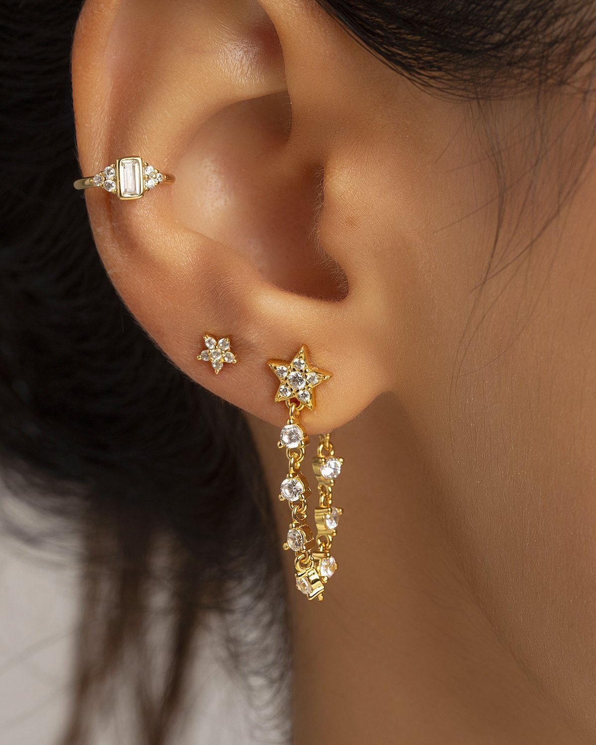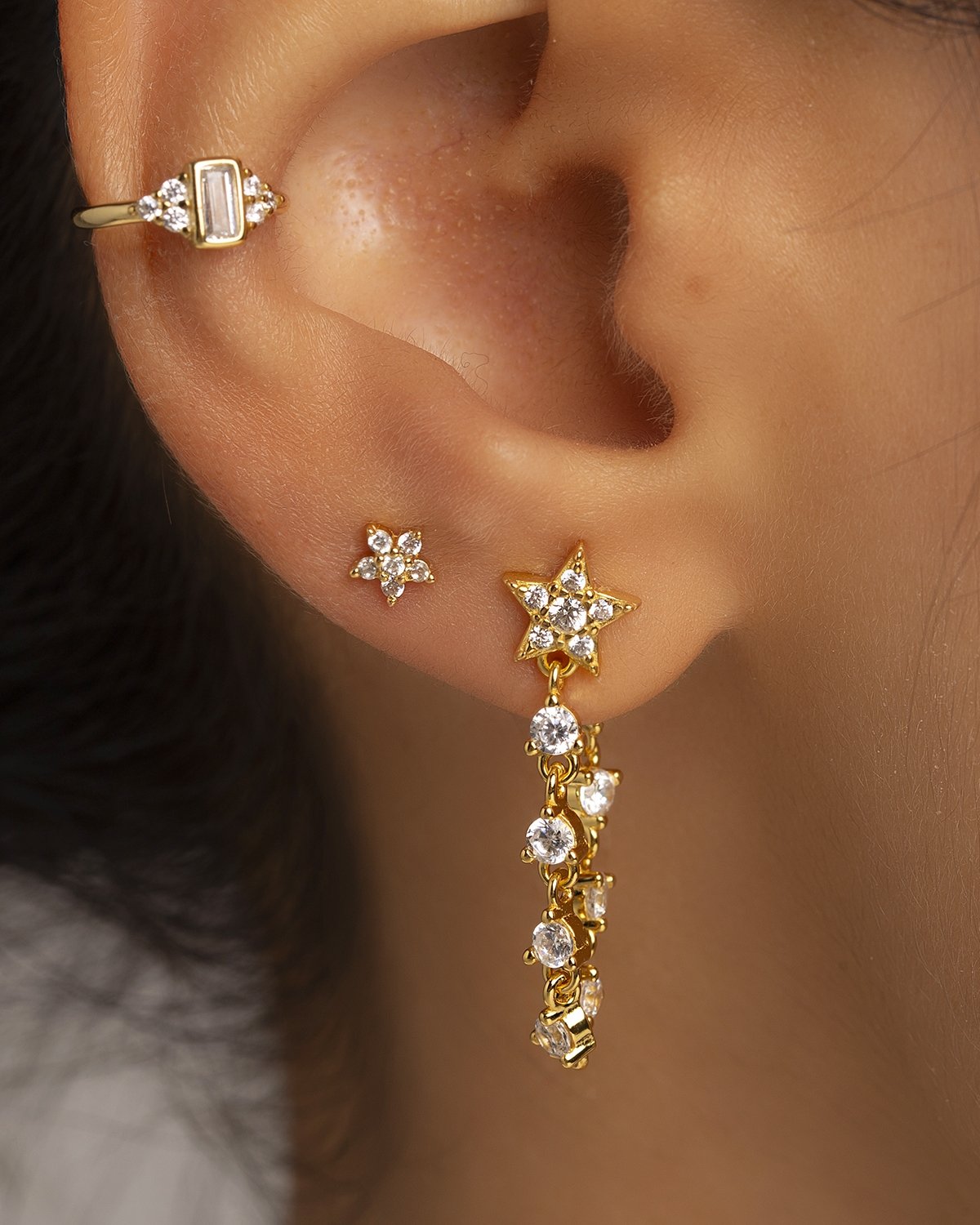 Andromeda gold son unos pendientes con una estrella y zirconitas colgando haciendo el un efecto cascada hechos en plata de ley 925 chapada en oro de 18 kilates.
