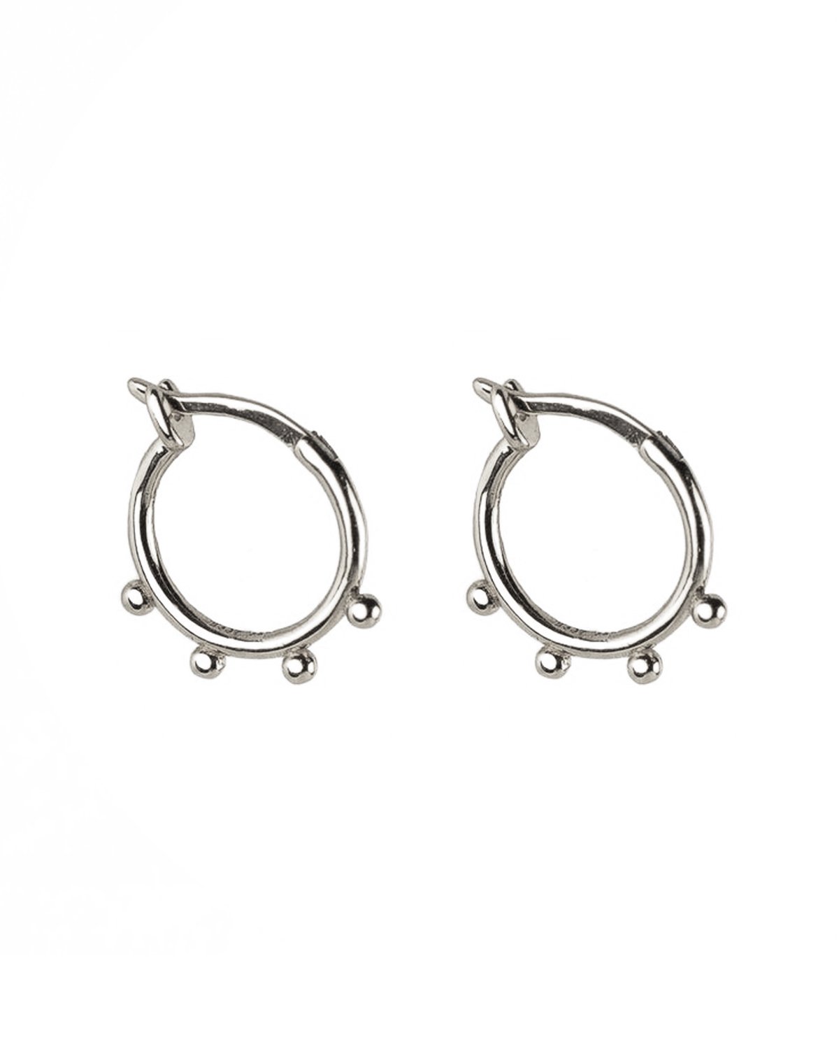 Pendientes aro pequeños con bolitas hechos en plata de ley 925. Estos pendientes minimalistas son perfectos para combinar con otros pendientes. Sus cierres de click, los hacen muy cómodos y podrás llevarlos en cualquier ocasión sin darte cuenta que los llevas puestos. Hipoalergenicos, ligeros y minimalistas.