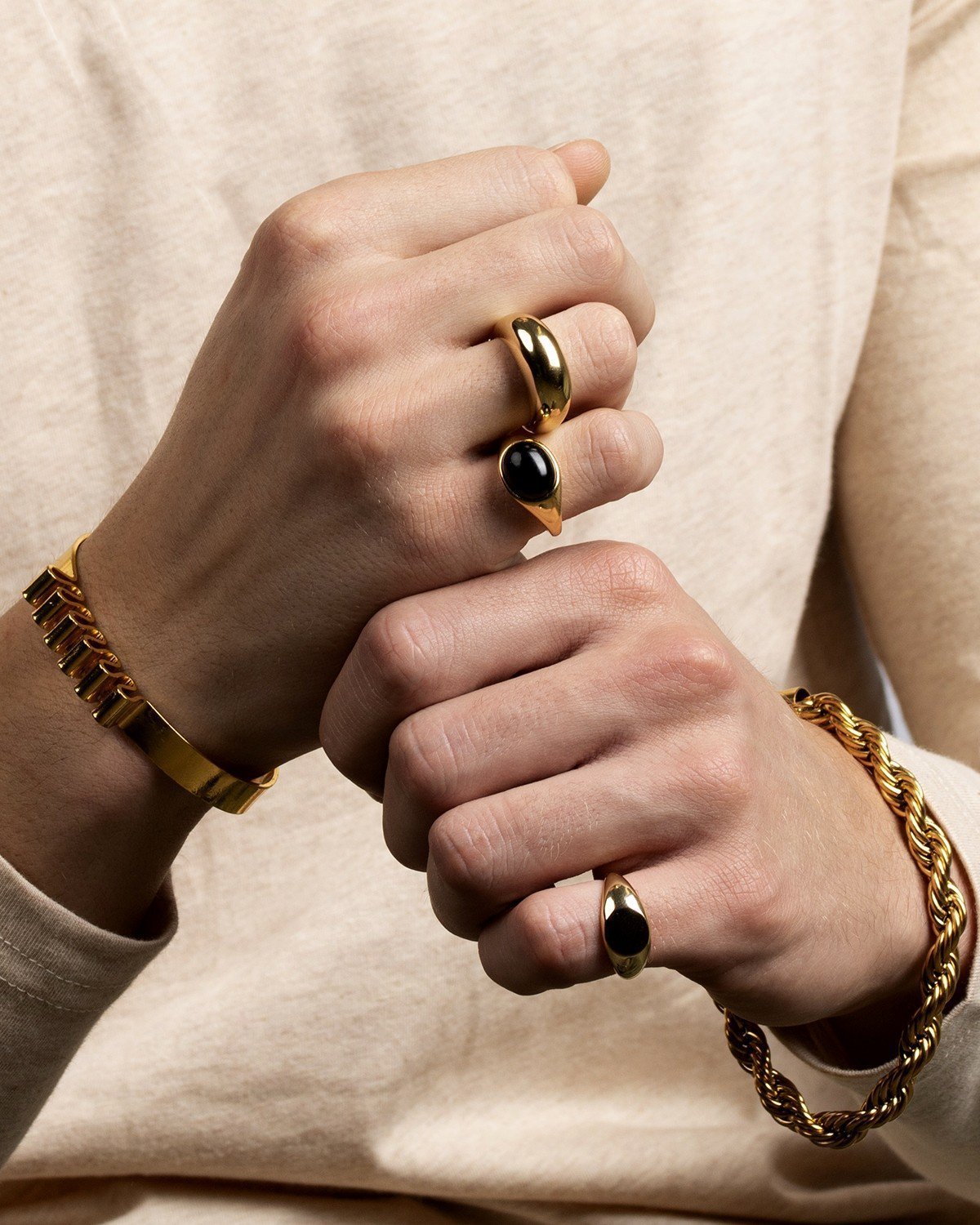 Anillo sello con una piedra de onyx negro natural de plata de ley 925 chapada en oro de 18 kilates. Ligero, hipoalergénico y minimalista.