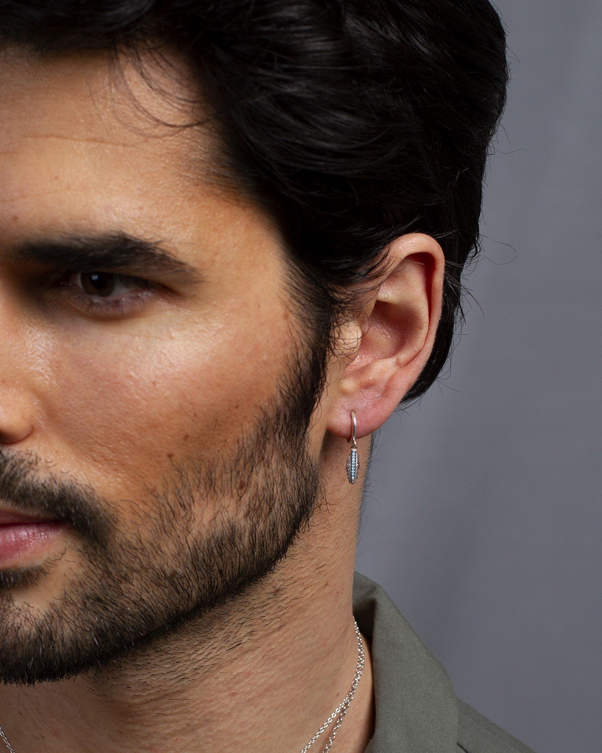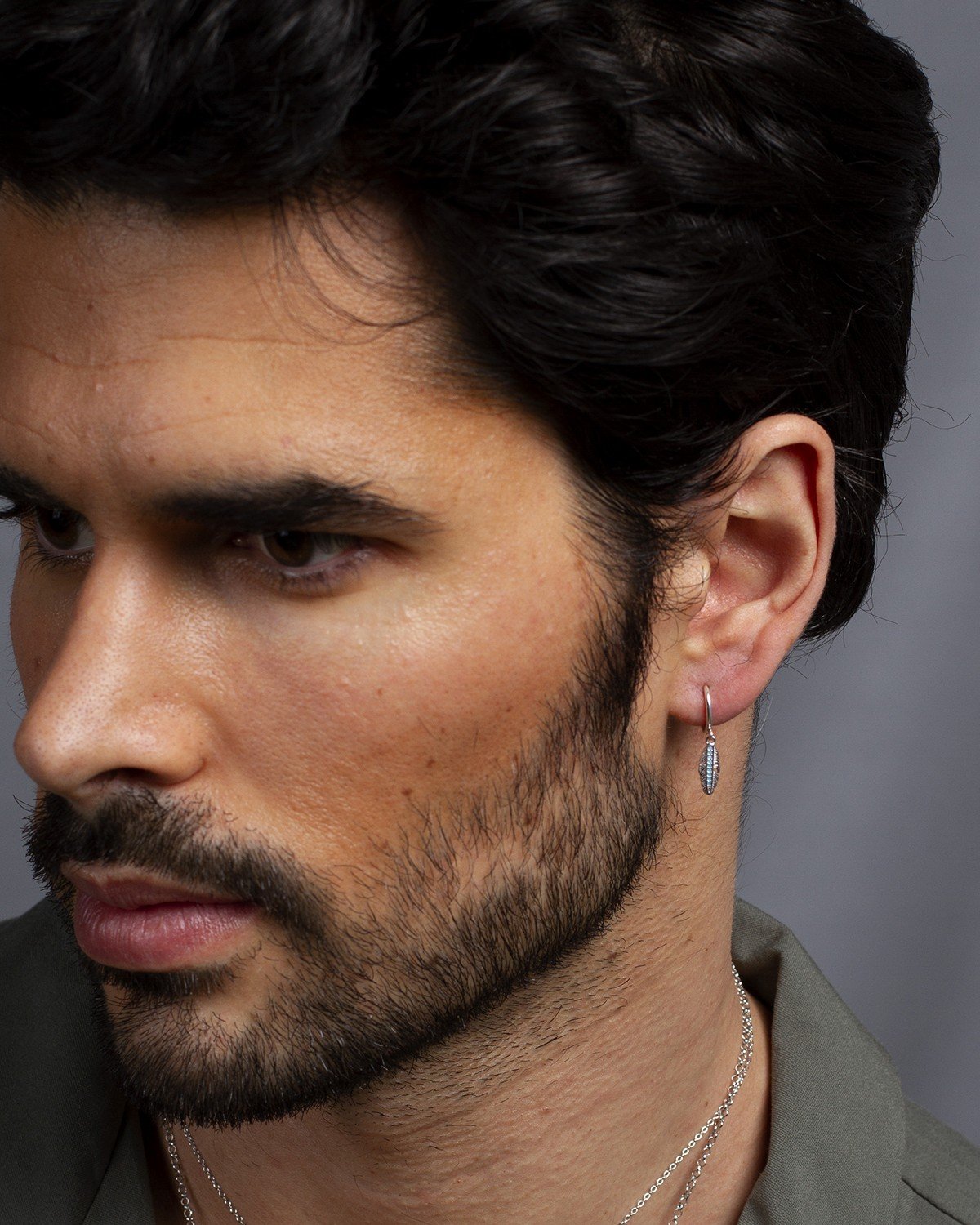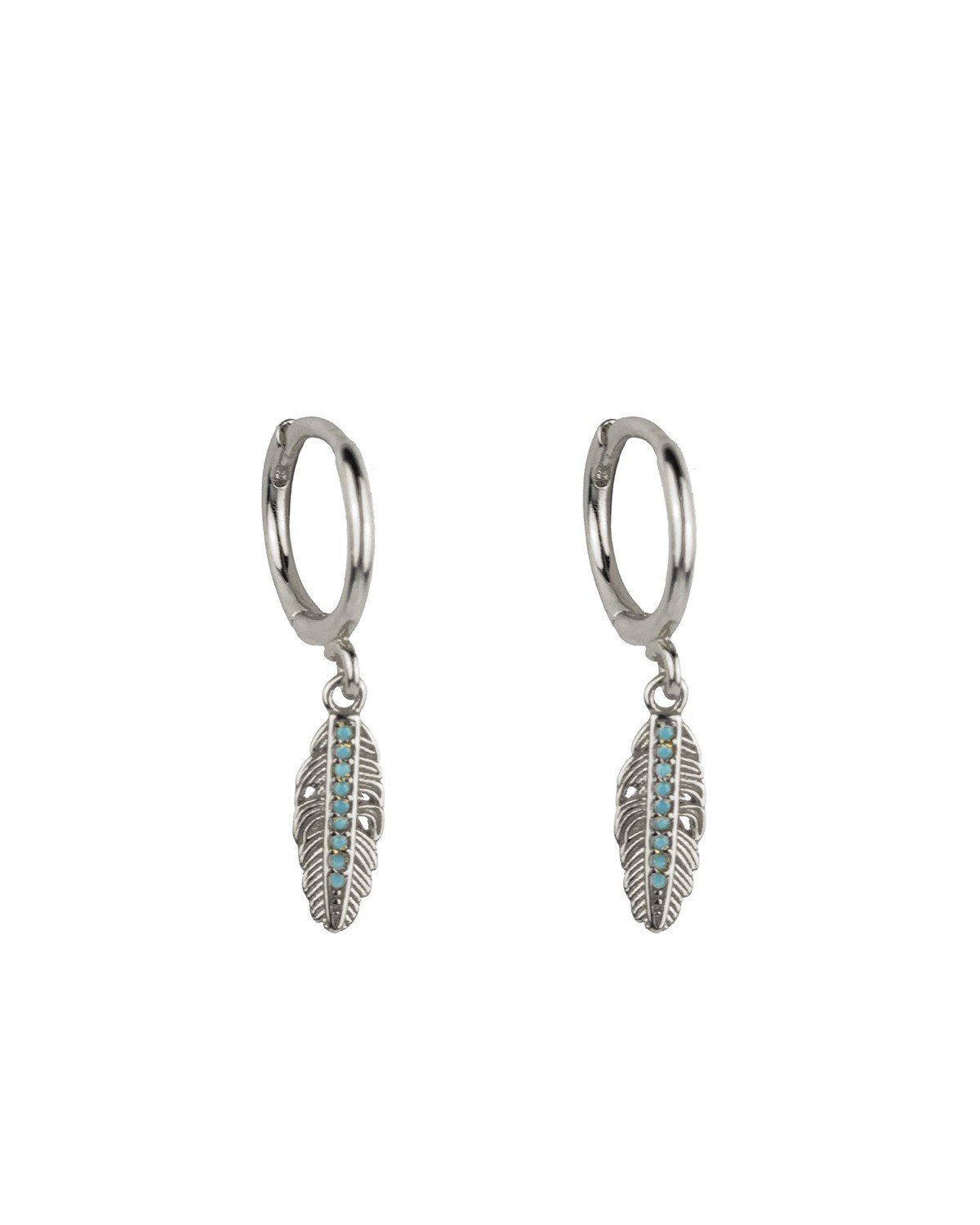 Pendientes aro de plata de ley 925 con un colgante en forma de pluma con turquesas naturales. Vendidos por par e individualmente.