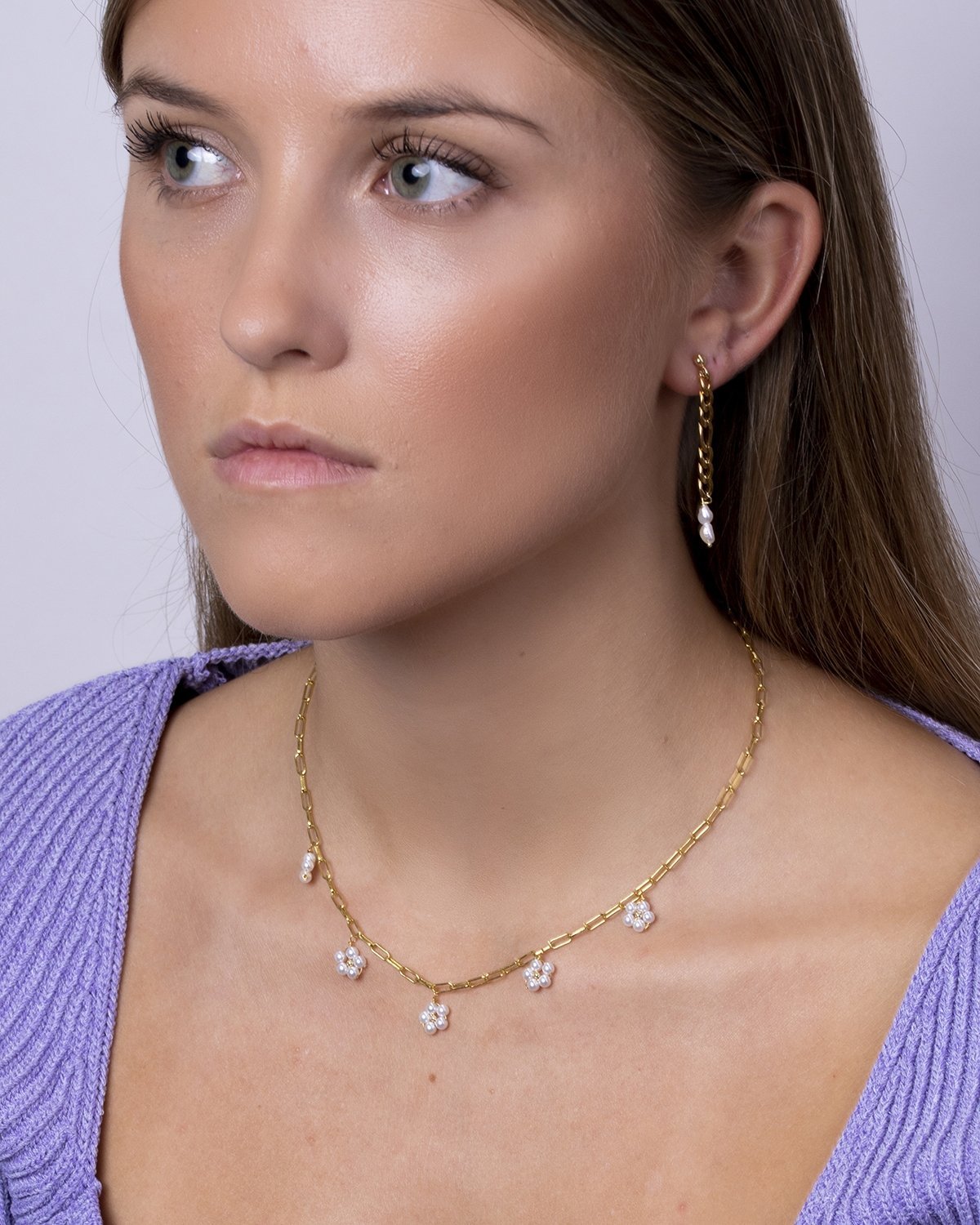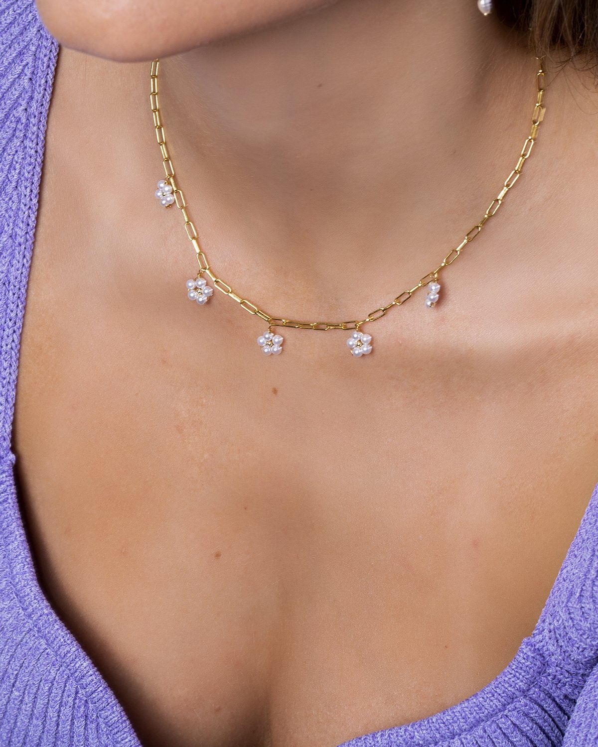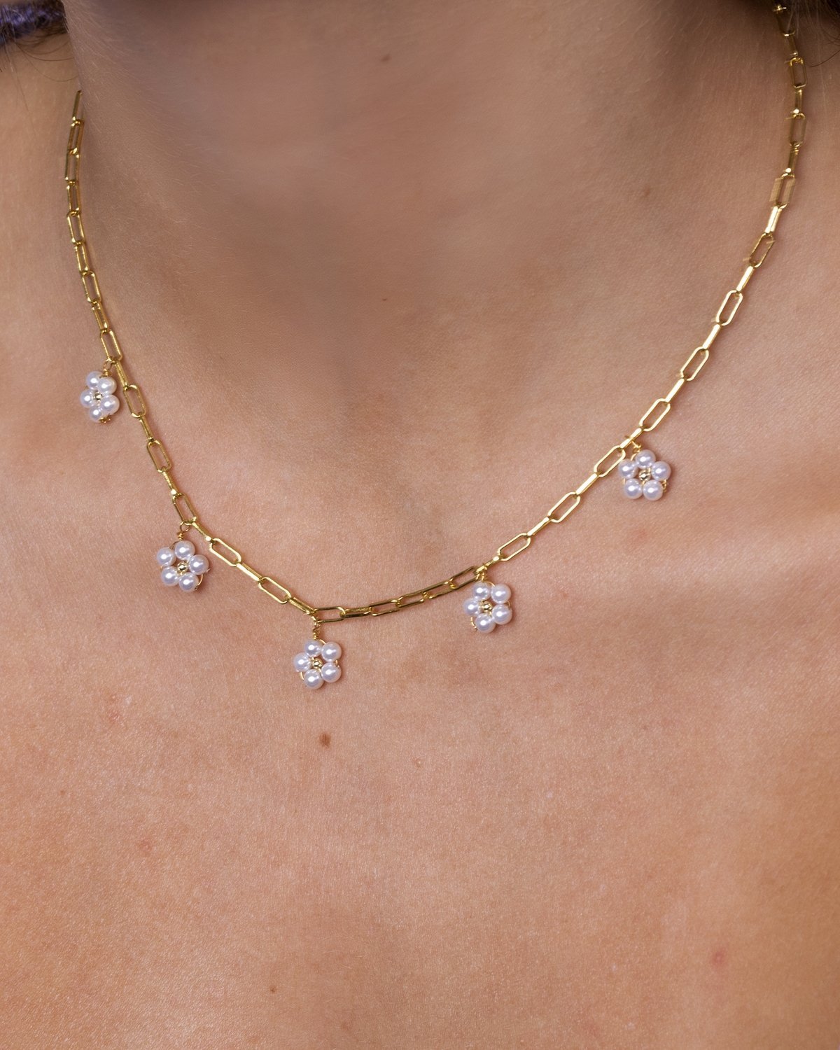 Diseño con cadena cuadrada y 5 colgantes en forma de margarita con perlas naturales, que añaden un toque de sofisticación y estilo natural.