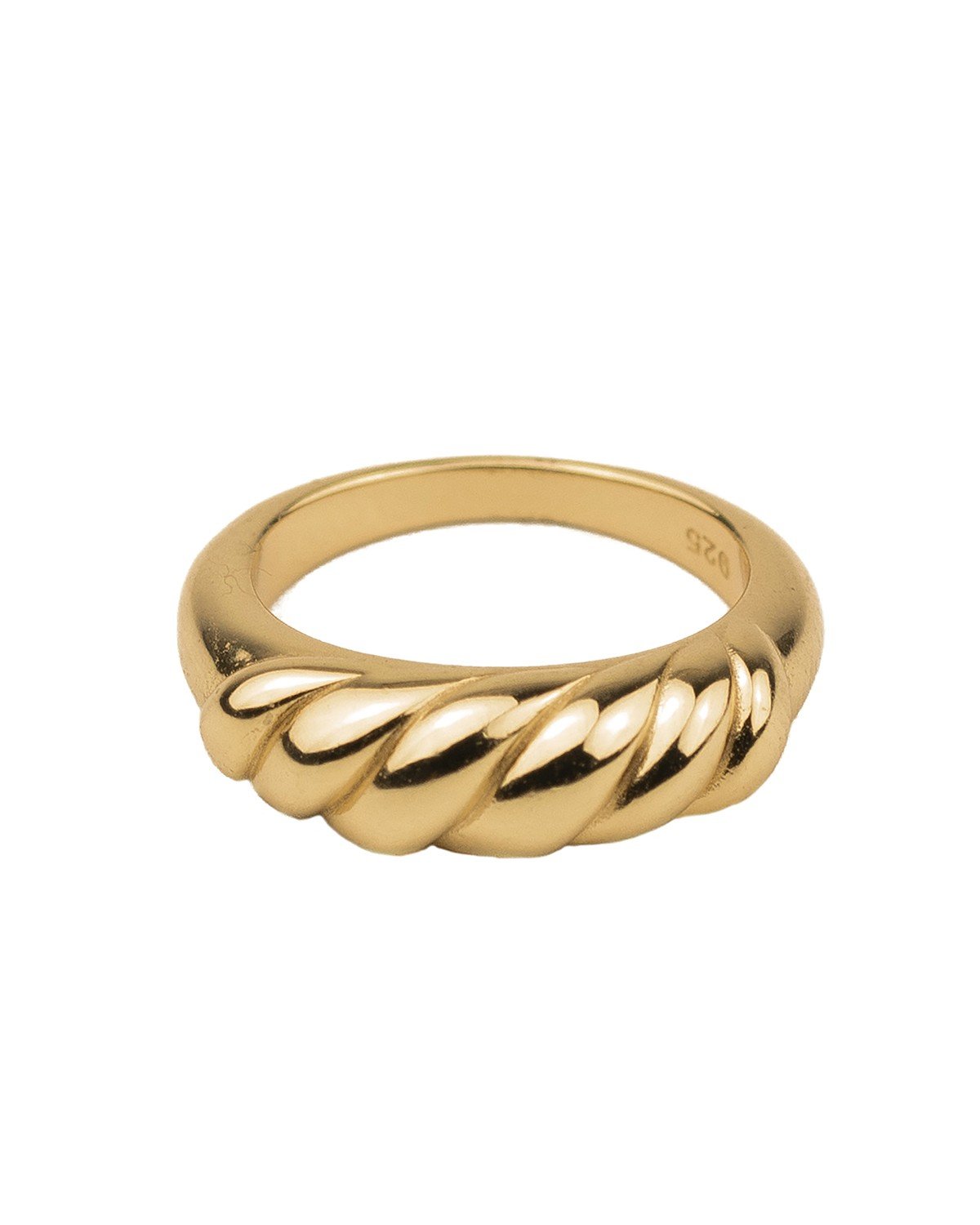 Este anillo sello trenzado está hecho en plata de ley 925 chapada en oro de 18 kilates y destaca por su original diseño en forma de croissant, inspirado en una de las últimas tendencias en joyería. Su forma única y su acabado elegante lo convierten en una pieza que completa a la perfección tanto look casuales como más sofisticados. Ideal para quienes buscan un toque moderno y diferente en su colección de anillos.
