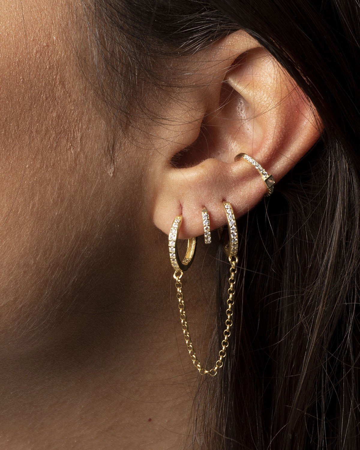 El Pendiente de Aro Doble con Cadena combina diseño contemporáneo y brillo, con dos aros de plata de ley 925 chapada en oro de 18 kilates conectados por una cadena decorativa con zirconitas brillantes. Es ideal para quienes tienen dos perforaciones en la oreja y buscan destacar con un accesorio único.