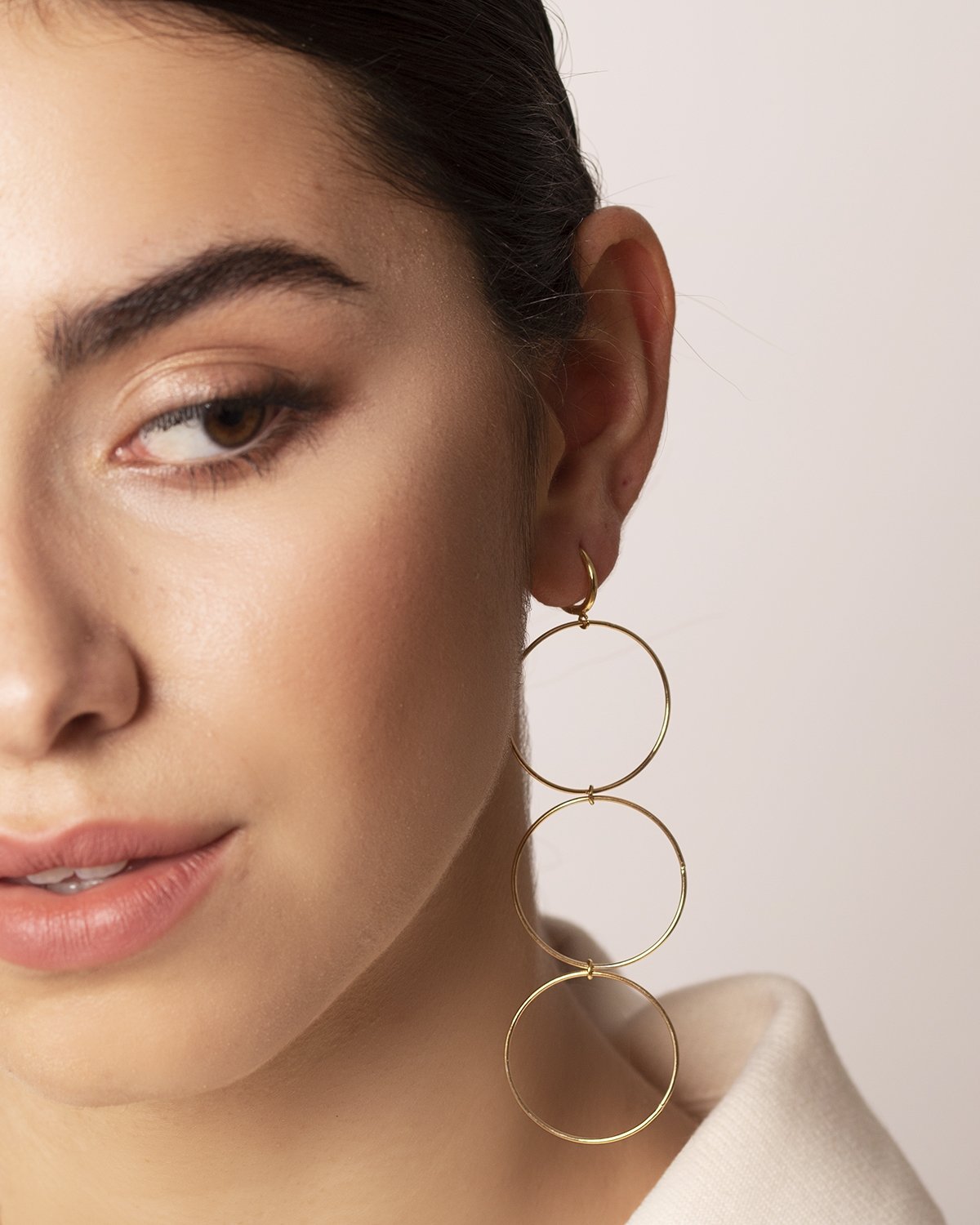 Pendientes de aro con un colgante formado por 3 círculos hechos en plata de ley 925 chapada en oro de 18 kilates.