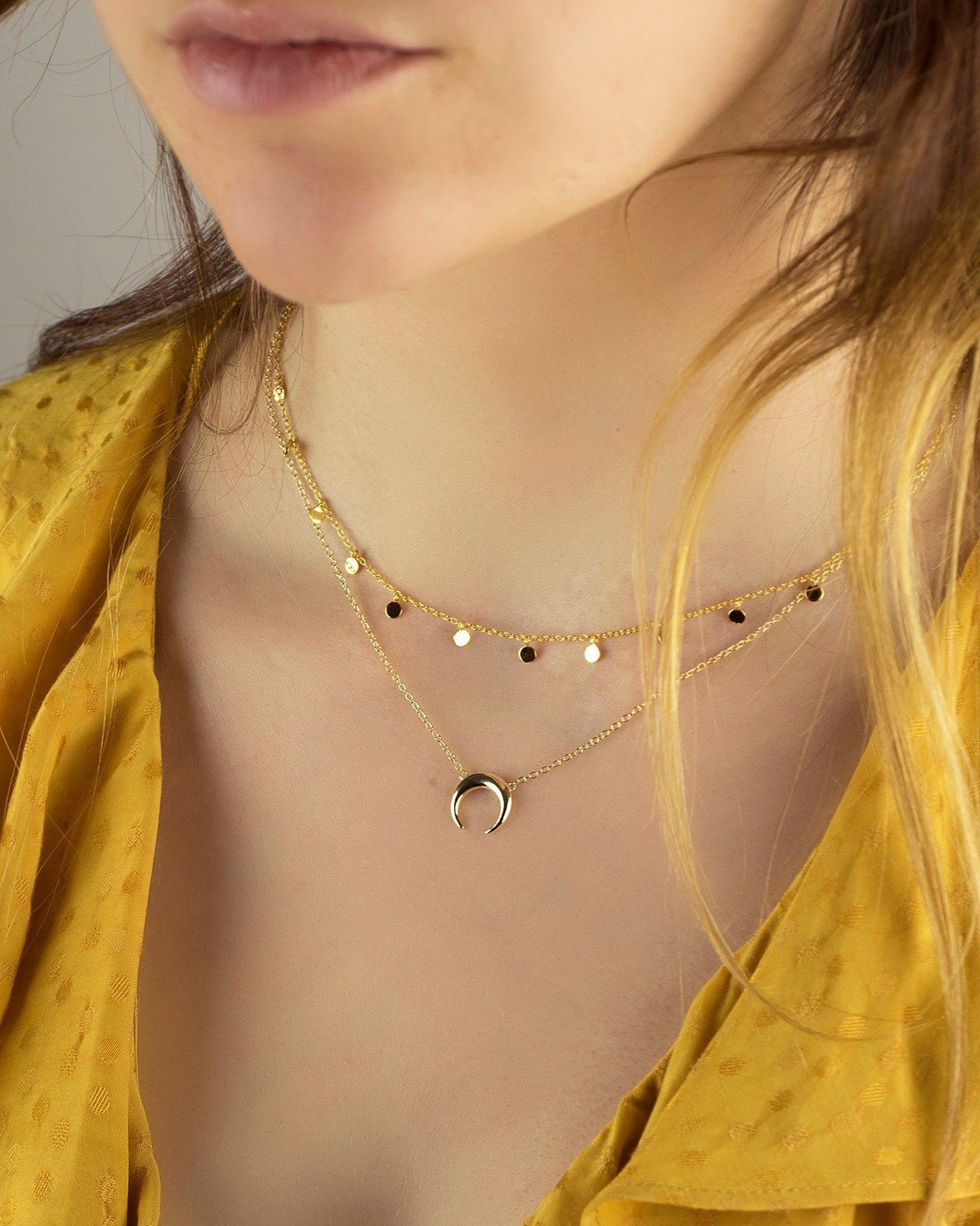 Este collar minimalista de plata de ley 925 chapada en oro de 18 kilates está compuesto por 12 delicadas plaquitas redondas de 3 mm, creando un efecto de textura sutil pero impactante. La cadena ajustable (38-43 cm) permite personalizar el largo para llevarlo como: