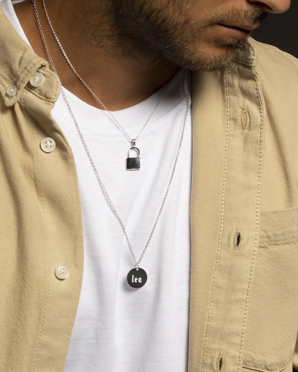Este collar masculino de plata de ley 925 combina un colgante redondo de 17 mm con una cadena ajustable (40 cm + 10 cm de extensión), ofreciendo versatilidad y la posibilidad de grabarlo con nombres, fechas o símbolos especiales. Ideal para hombres que buscan joyería con significado.