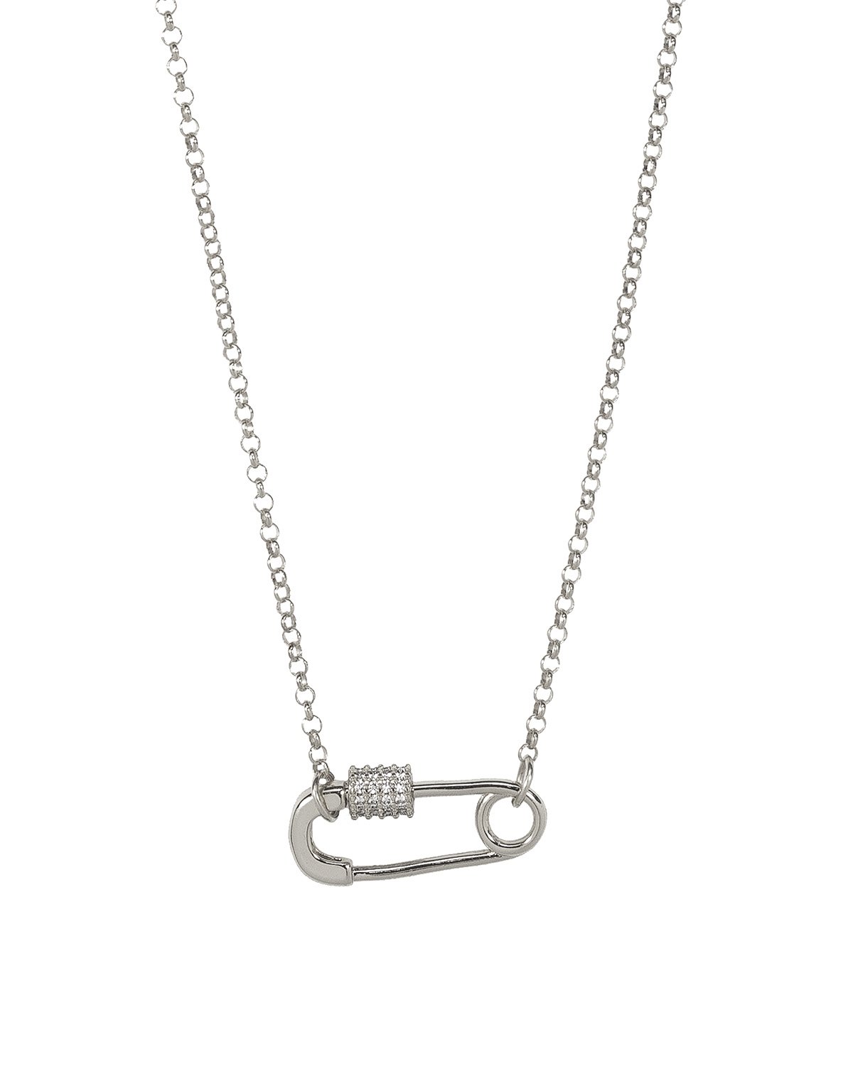 Un diseño vanguardista que reinventa un clásico: este collar presenta un colgante en forma de mosquetón-imperdible adornado con zirconitas cúbicas que brillan intensamente. Fabricado en plata de ley 925, combina el estilo urbano con un toque de lujo contemporáneo.