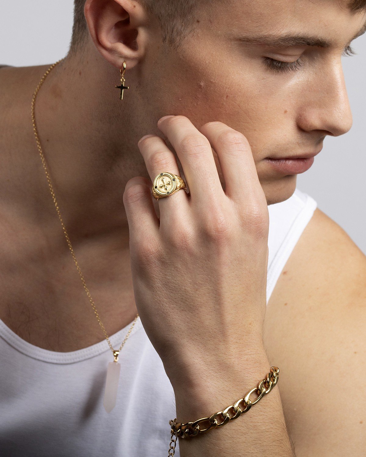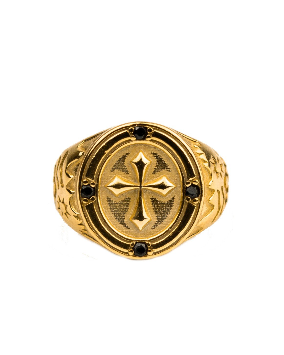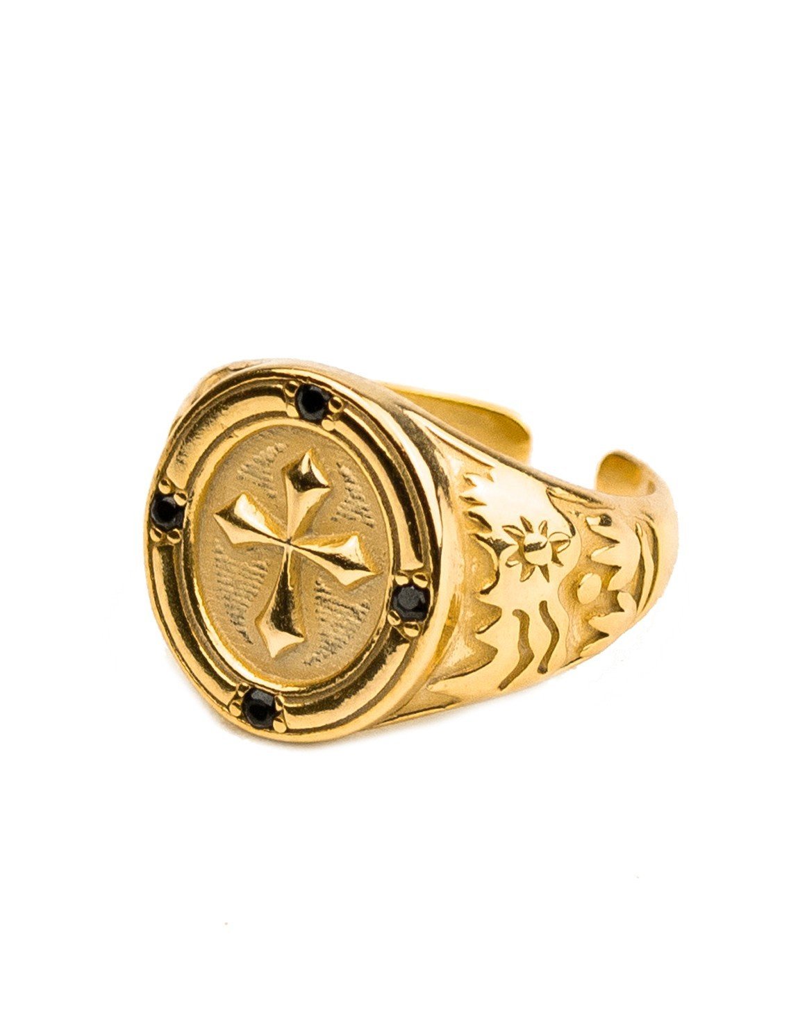 Anillo sello con una cruz y cuatro zirconitas brillantes negras hecho en plata de ley 925 chapada en oro de 18 kilates. Al ser un anillo abierto, es ajustable a todas las tallas.