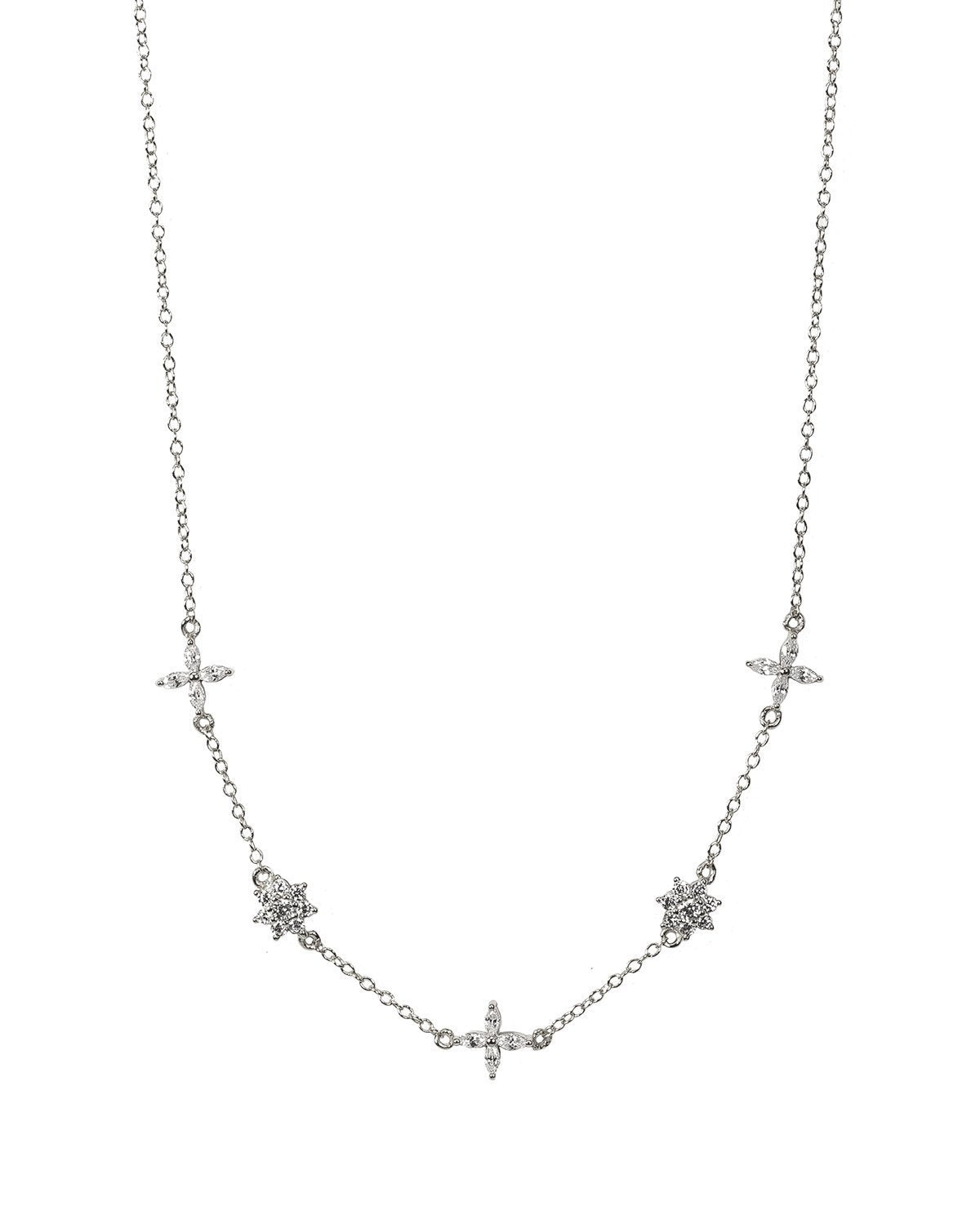 Collar de Flores con Zirconias - Plata de Ley 925 Elegante collar con cinco flores de zirconias cúbicas engastadas en plata de ley 925. Su diseño delicado y brillante lo convierte en el complemento perfecto para cualquier ocasión, desde looks casuales hasta eventos especiales. Características principales:
