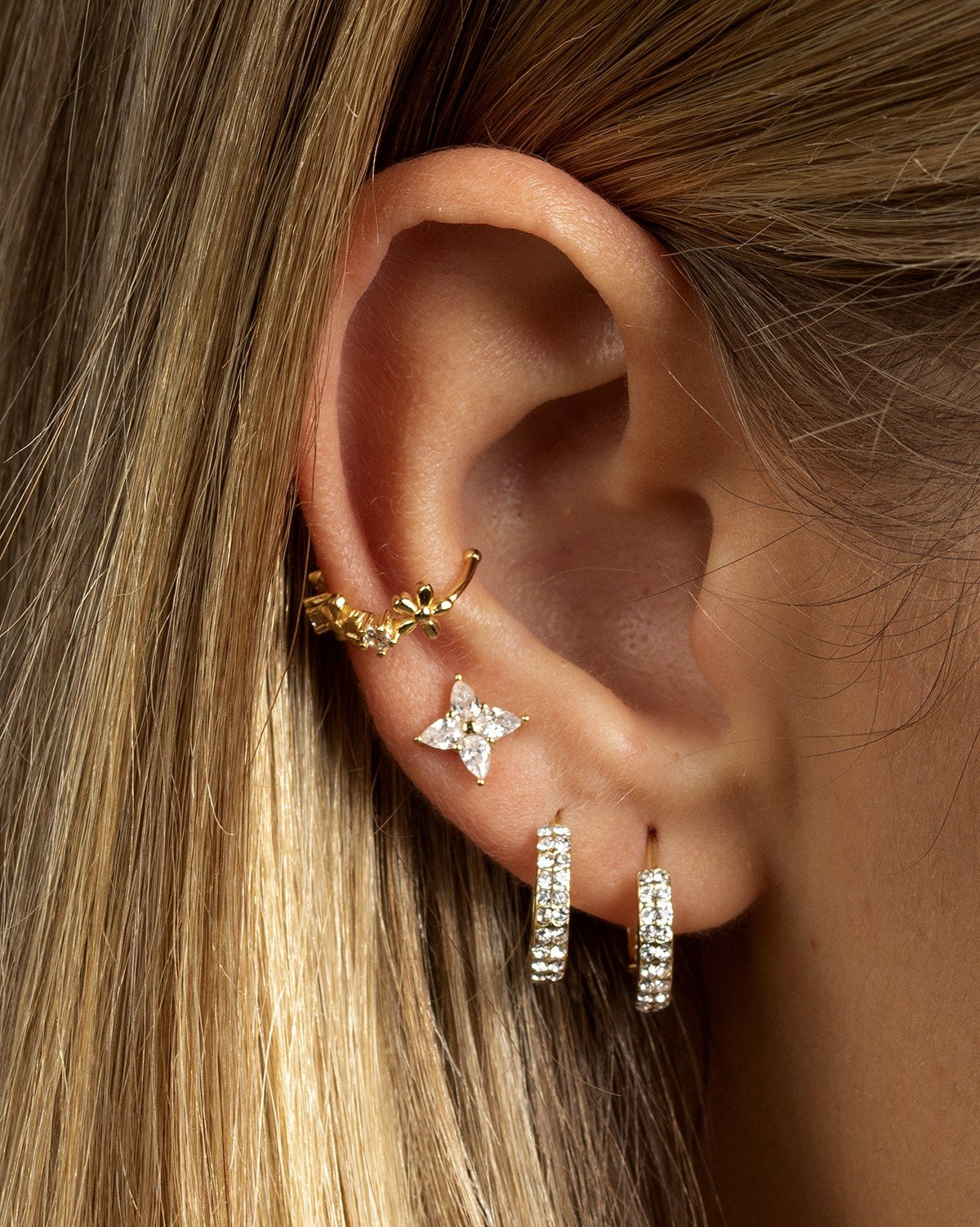 Este ear cuff con pequeñas flores y zirconitas brillantes está hecho en plata de ley 925 chapada en oro de 18 kilates y es el accesorio perfecto para darle un toque chic y natural a tus looks. Con un diseño ajustable, puedes llevarlo en el cartílago de la oreja sin necesidad de agujeros, imitando el estilo de un aro pero con toda la comodidad. Disponible suelto o en par, es ideal para combinar o para llevar solos y destacar con estilo.