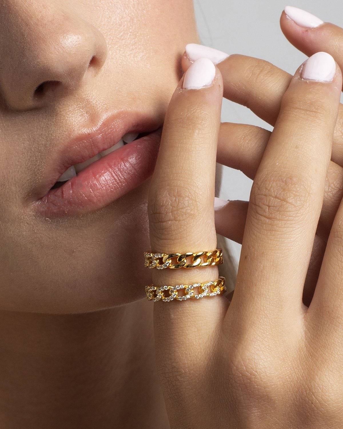 Este anillo alianza tiene un diseño único, con una estructura en forma de cadena que se destaca por un elegante pavé de zirconitas en la parte central. Hecho en plata de ley 925 chapada en oro de 18 kilates, su sofisticado diseño lo convierte en una pieza perfecta para ocasiones especiales o para añadir un toque elegante a tu look diario.