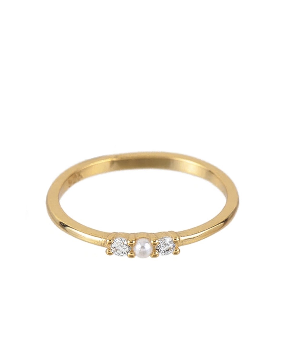 Este delicado anillo de plata de ley 925 chapada en oro de 18 kilates cuenta con una perla central que irradia sofisticación, complementada por dos zirconitas cúbicas brillantes a cada lado. Su diseño simple pero refinado lo convierte en una pieza ideal para cualquier ocasión, desde looks diarios hasta eventos especiales.