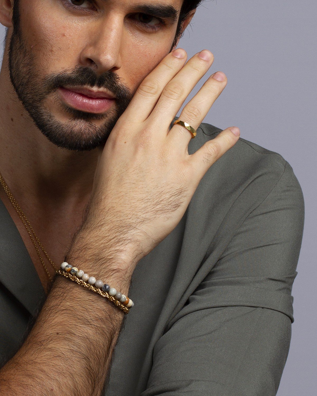 Anillo estilo banda facetado hecho en plata de ley 925 chapada en oro de 18 kilates.